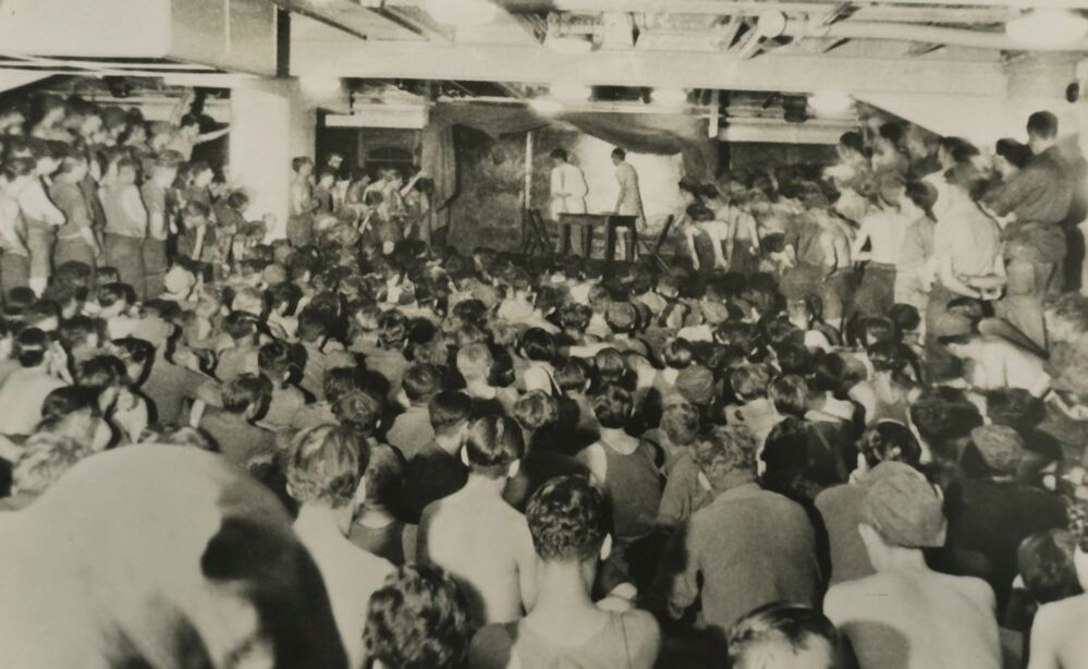 Deze opname is afkomstig uit de korte fotoreportage van het vetrek der 7 December Divisie. Met het 'Motorschip Ruijs' werd de reis van Amsterdam naar Batavia gemaakt. 'De RAO organiseert o.a. ook cabaretavonden'.