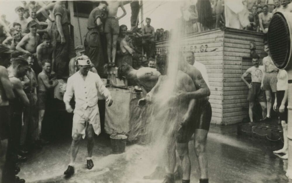 Deze opname is afkomstig uit de korte fotoreportage van het vetrek der 7 December Divisie. Met het 'Motorschip Ruijs' werd de reis van Amsterdam naar Batavia gemaakt. 'Eindelijk de verlossende, maar krachtdadige doop'.