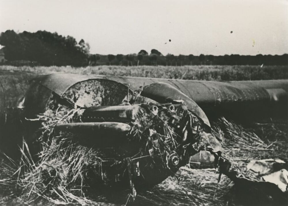Na een noodlanding is de motor en een gedeelte van de vleugel van deze Whitley geslagen. De bemanning van de bommenwerper werd gevangen genomen.