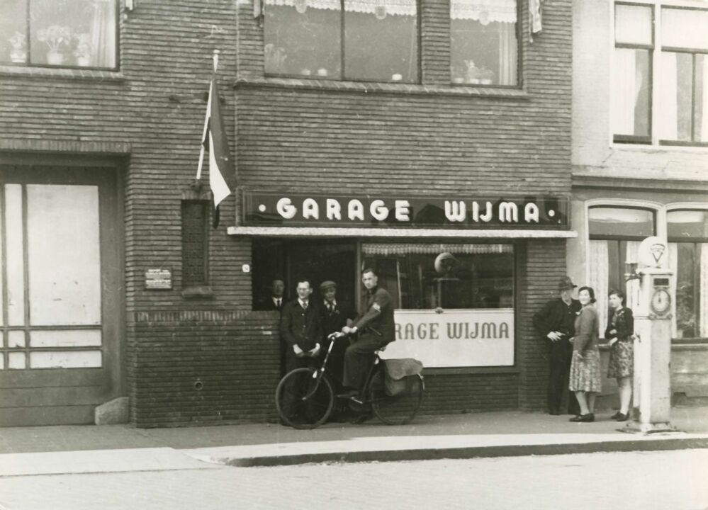 Een gezicht op de voorzijde van Garage Wijma. Deze was gevesigd op de hoek van de Oosterkade en de Keizersgracht. Een lid van de N.B.S. geeft het laatste nieuws door.