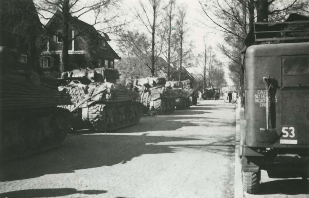 Op 15 april 1945 werd Leeuwarden door de Canadese Strijdkrachten bevrijd. Hier ziet men een aantal 'Shermantanks' op de hoek van de Engelsestraat en Harlingerstraatweg geparkeerd staan.