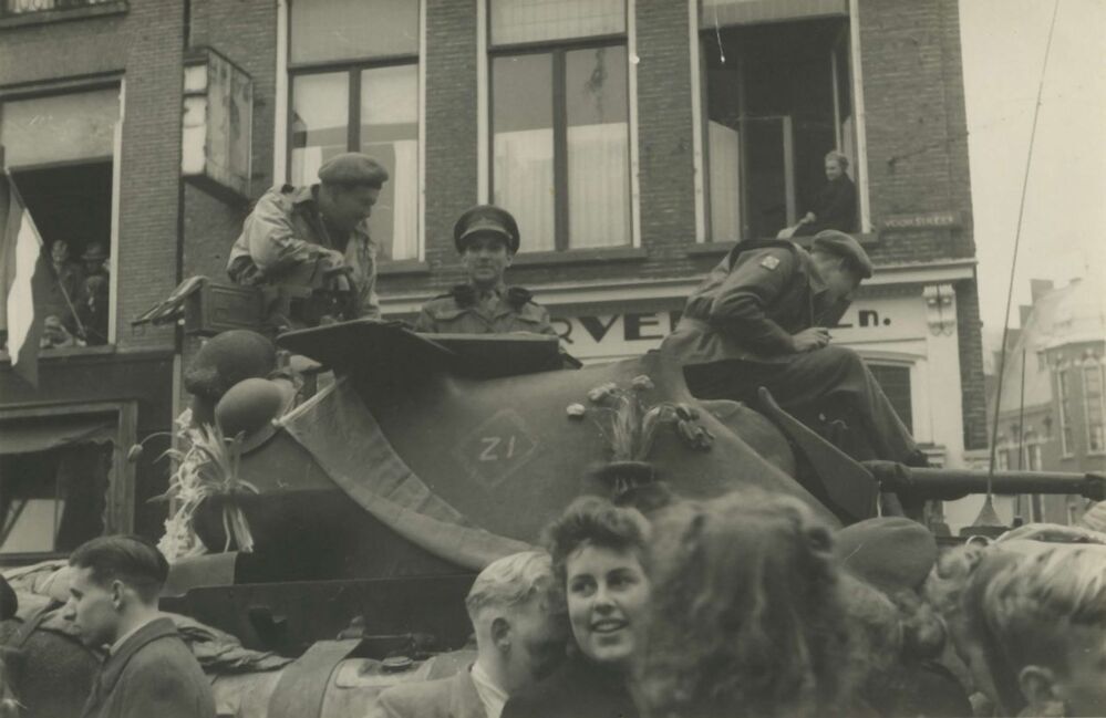 Op 15 april 1945 werd Leeuwarden door de Canadese Strijdkrachten bevrijd. De mensen verdringen zich bij een 'Staghound' welke aan de Voorstreek geparkeerd staat. De militairen genieten zichtbaar van deze belangstelling.