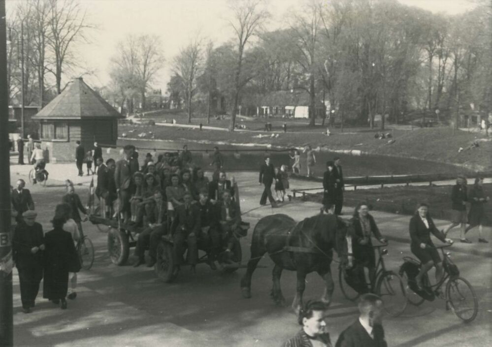 Op 15 april 1945 werd Leeuwarden door de Canadese Strijdkrachten bevrijd. Om even over twaalf uur rolden de gevechtswagens van de 'Royal Canadian Dragoons', zonder dat er een schot gelost werd, langs de Groningerstraatweg de stad binnen. Hier ziet men een groepje enthousiaste Leeuwarders bij de Vrouwenpoortsbrug richting binnenstad rijden.
