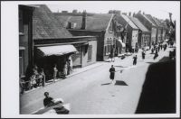 Kruiseind in de richting Pandelaar-Deel, gezien vanaf Haageijk. Links: Café "Onder de Boompjes" van Jos van de Elzen (tevens vrachtrijder). Rechts: raam van bakker (voorheen groentezaak) wed. Petronella an. Koll-Jonkers en zoon Leo. Tekst op bord met mannenfiguur: Theo Snijders. Kleermaker. Pand met luifel: slager Johan van der Linden- Jeurgens; thans (1995) cafetaria. Panden tot slager van der Linden zijn ca. 1970 gesloopt t.b.v. Vondellaan. Ter hoogte van het foto-opnamepunt is in 1990 de eerste rotonde in de gemeente Gemert aangelegd. (Haageijk-De Haag-Kruiseind-Vondellaan). Deze prentbriefkaart werd met een begeleidende brief (dd. 26 mei 1995) aan het Gemeentearchief geschonken door Mr. & Mrs. John & Celia Bergess, Malvern 3 Kilgrimol Gardens, St. Annes FY8 2QY, Lancashire, England. Mr. &Mrs. Burgess schonken de kaart namens hun (schoon)vader Mr. ... n.a.v. hun bezoek aan Gemert eind september 1994, tijdens de feestelijke herdenking "Gemert bezet- Gemert bevrijd 1944- 1994". Na de bevrijding van Gemert (25 sept.1944) verbleef Mr. ... hier tijdelijk en had toen als aandenken de prentbriefkaart meegenomen.