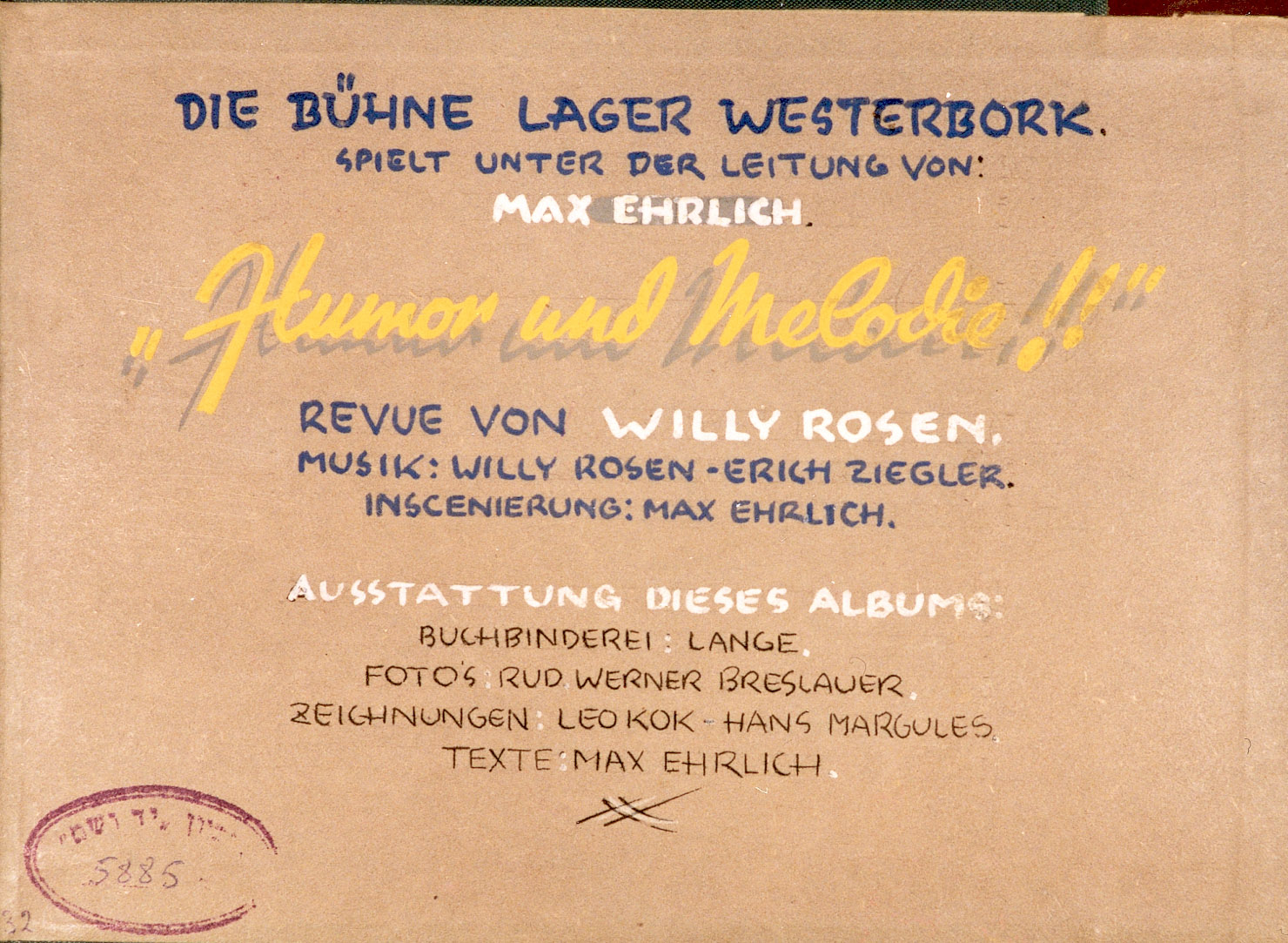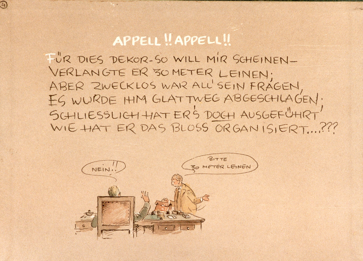 Appell!! Appell!! Appell!! Lied uit het boek 'Humor und Melodie'. Tekst met illustratie. Kamp Westerbork, 1943-09-27. Betreft een foto van het boek 'Humor und Melodie' (Cabaret). De getekende personen stellen kampcommandant Gemmeker (achter zijn bureau) en Max Ehrlich voor.