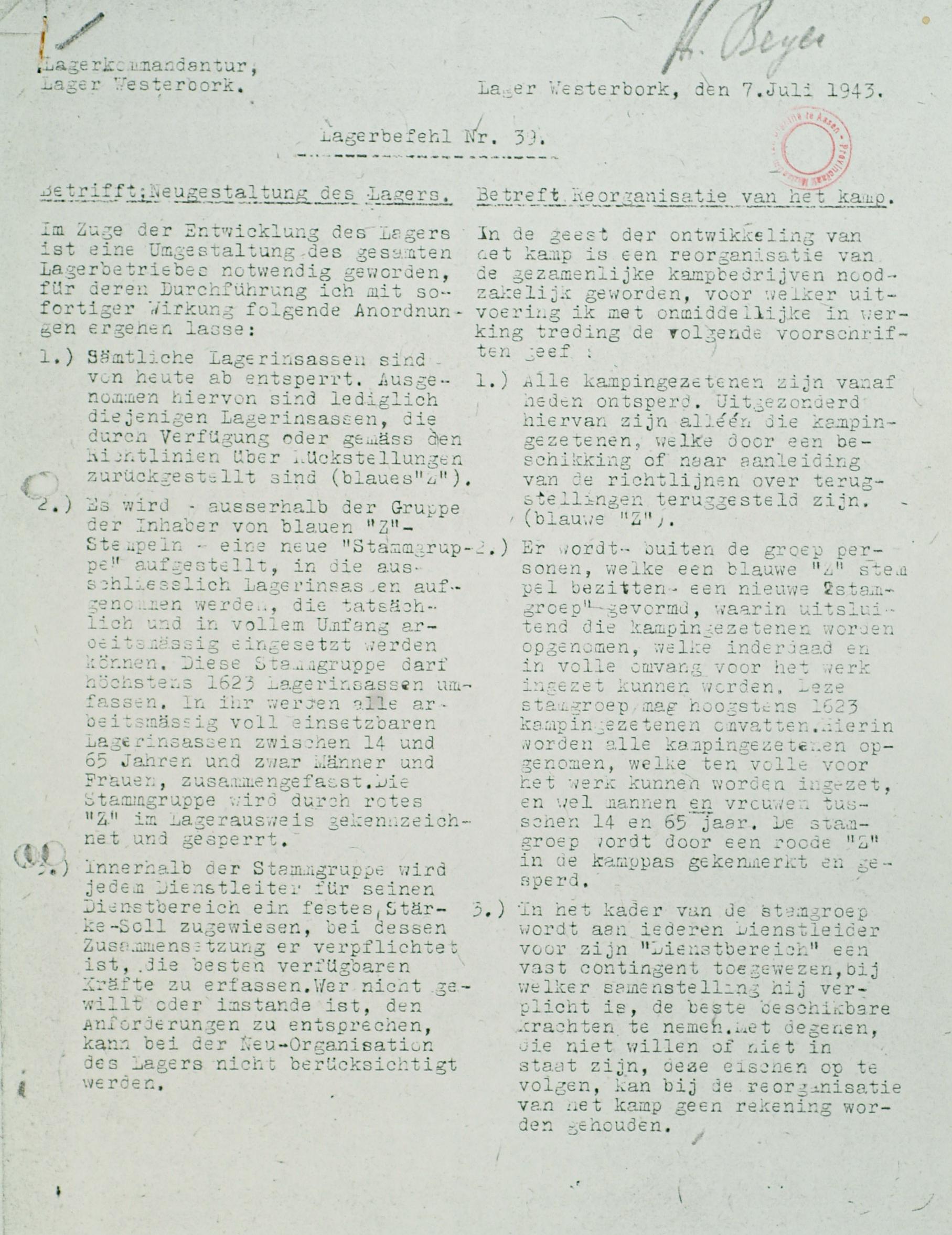 Lagerbefehl No. 10 Datum: 1943-02-25 Plaats: Westerbork, kamp Onderwerp: Spertijd voor (bezitters van een 'Z'' stempel en de rest van de kampgevangenen) Plaatsvervangend dienstleider DB1; Inleveren van vergunningen; Inlichtingen van het woningbureau.