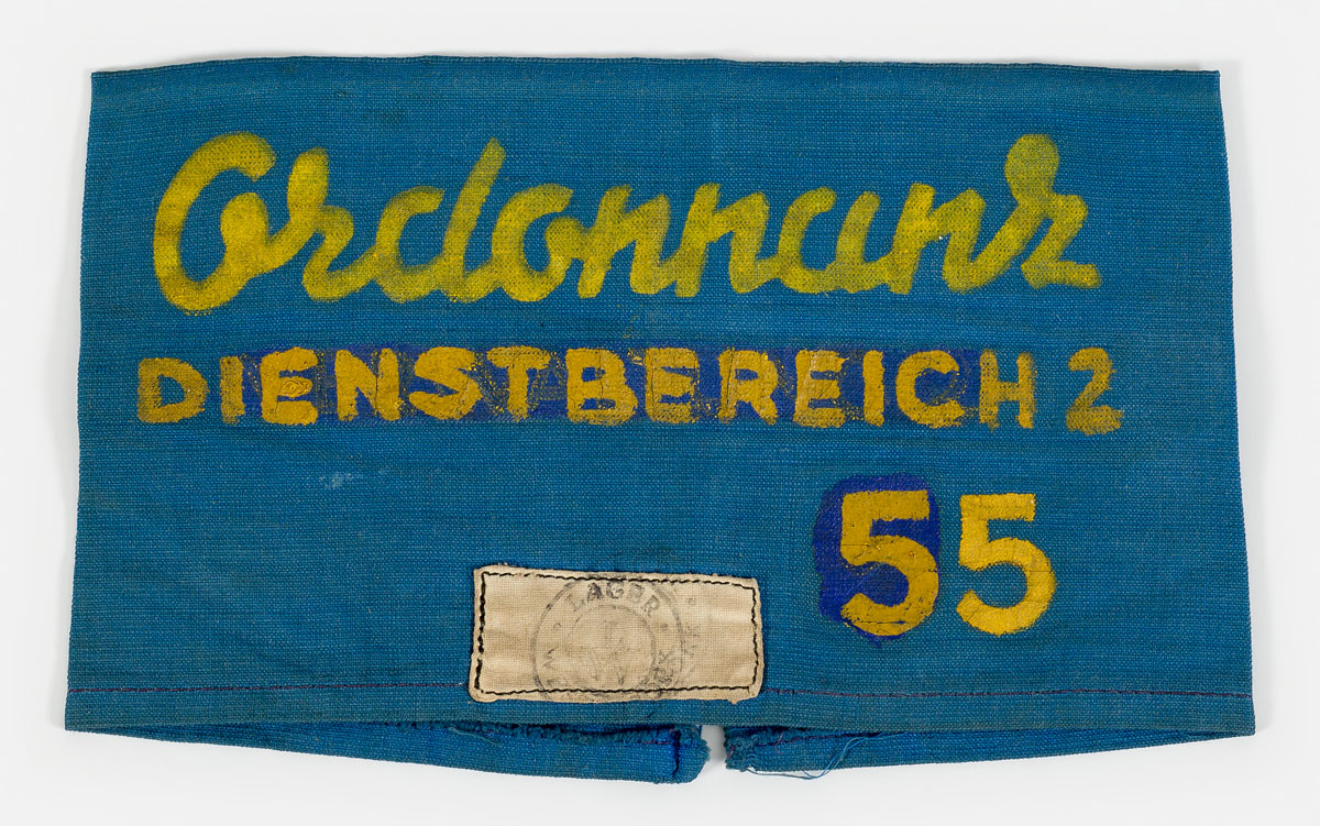 Linnen armband, kleur donkerblauw met opschrift: Ordonnanz, dienstbereich 2 Nummer 55 Met stempel Lager Westerbork.