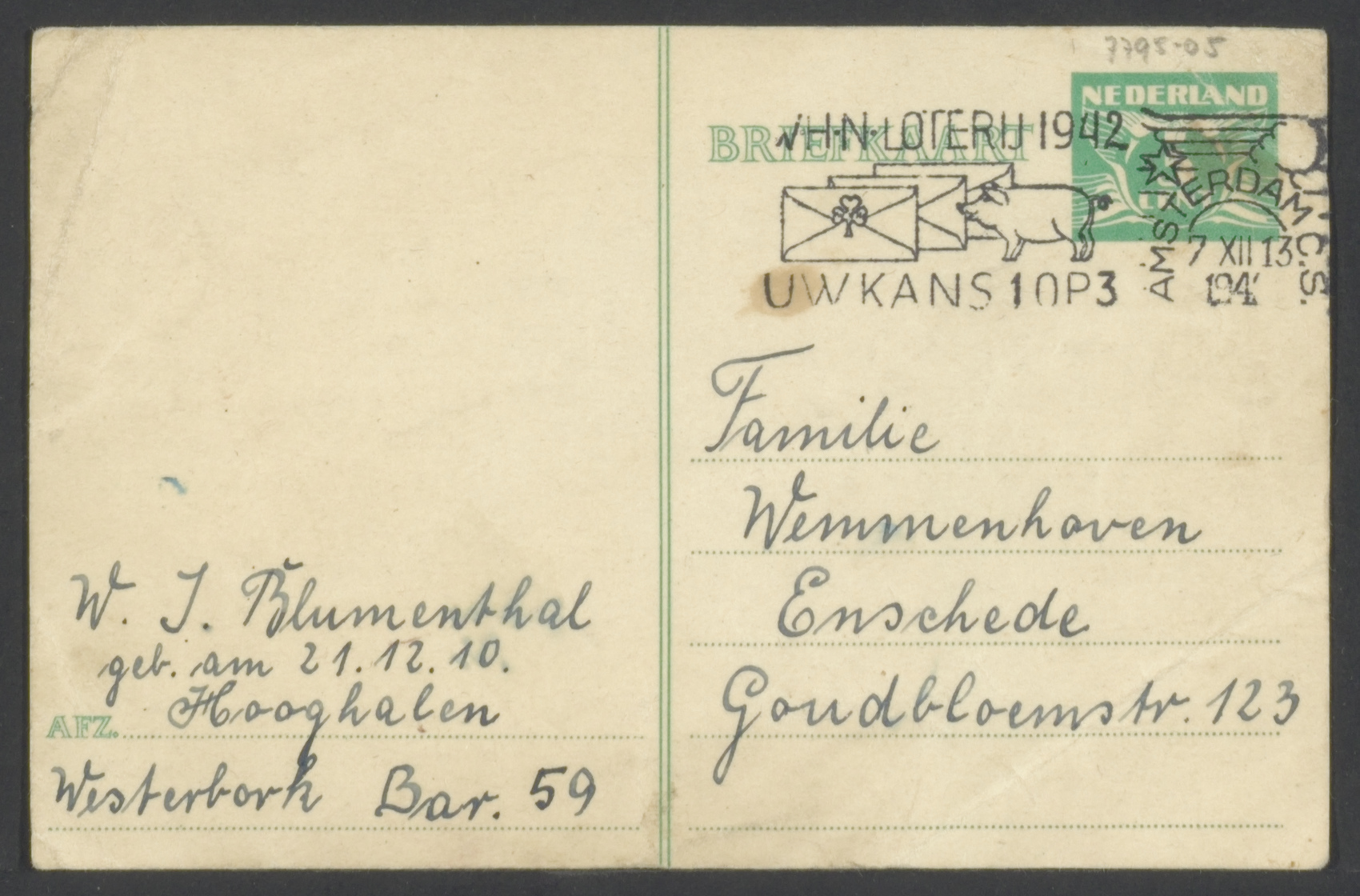 Briefkaart van G. Blumenthal-Wertheim aan fam. Wemmenhoven vanuit kamp Westerbork