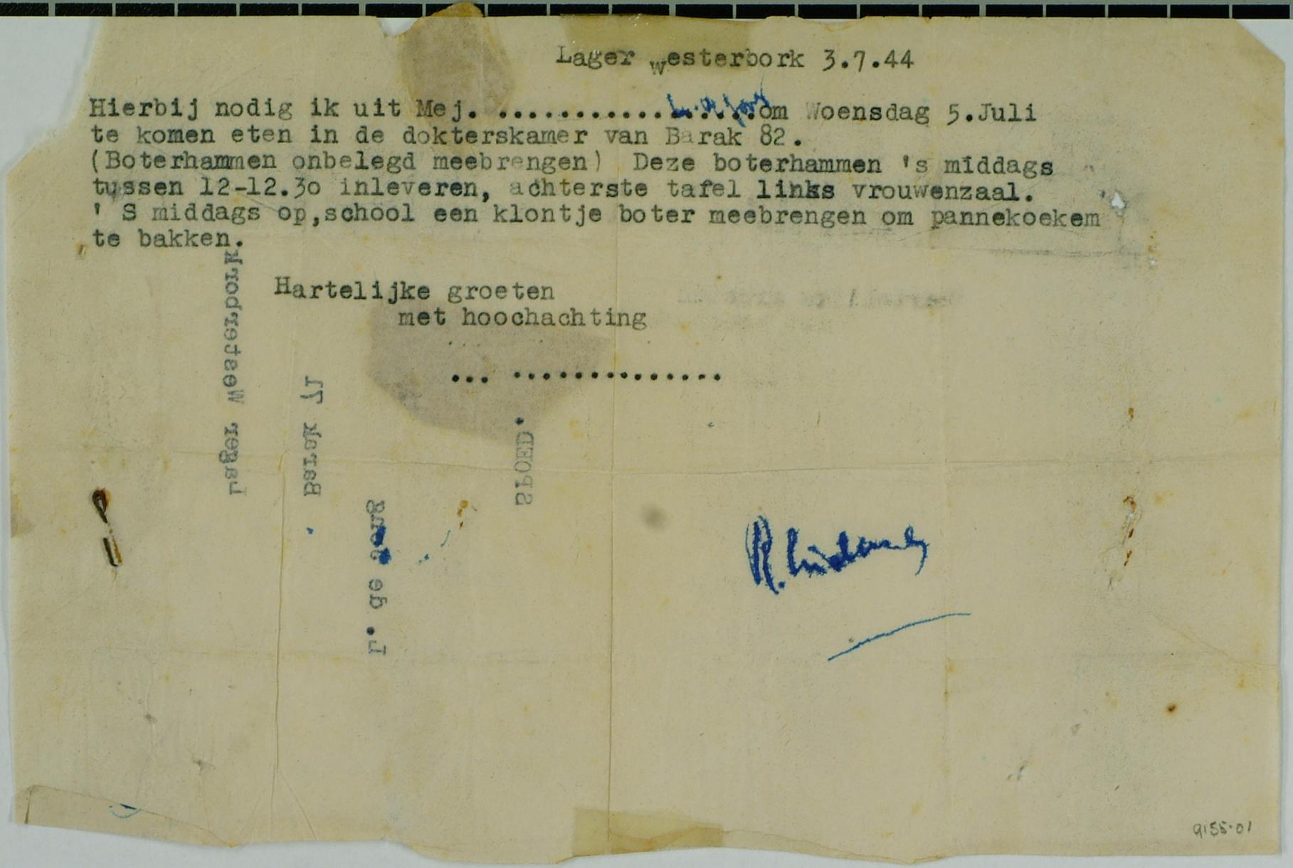 Uitnodiging voor een verjaardag Betreft een uitnodiging van Rootje Lindeman aan Leontine de Jong om te komen eten in de dokterskamer van barak 82. Plaats: Westerbork, kamp Datum: 1944-07-03 Bijz.: briefje is getypt.