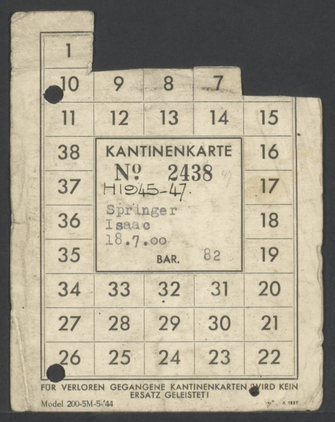 Kantinekaart Plaats: Westerbork, kamp Van: Springer, Isaac