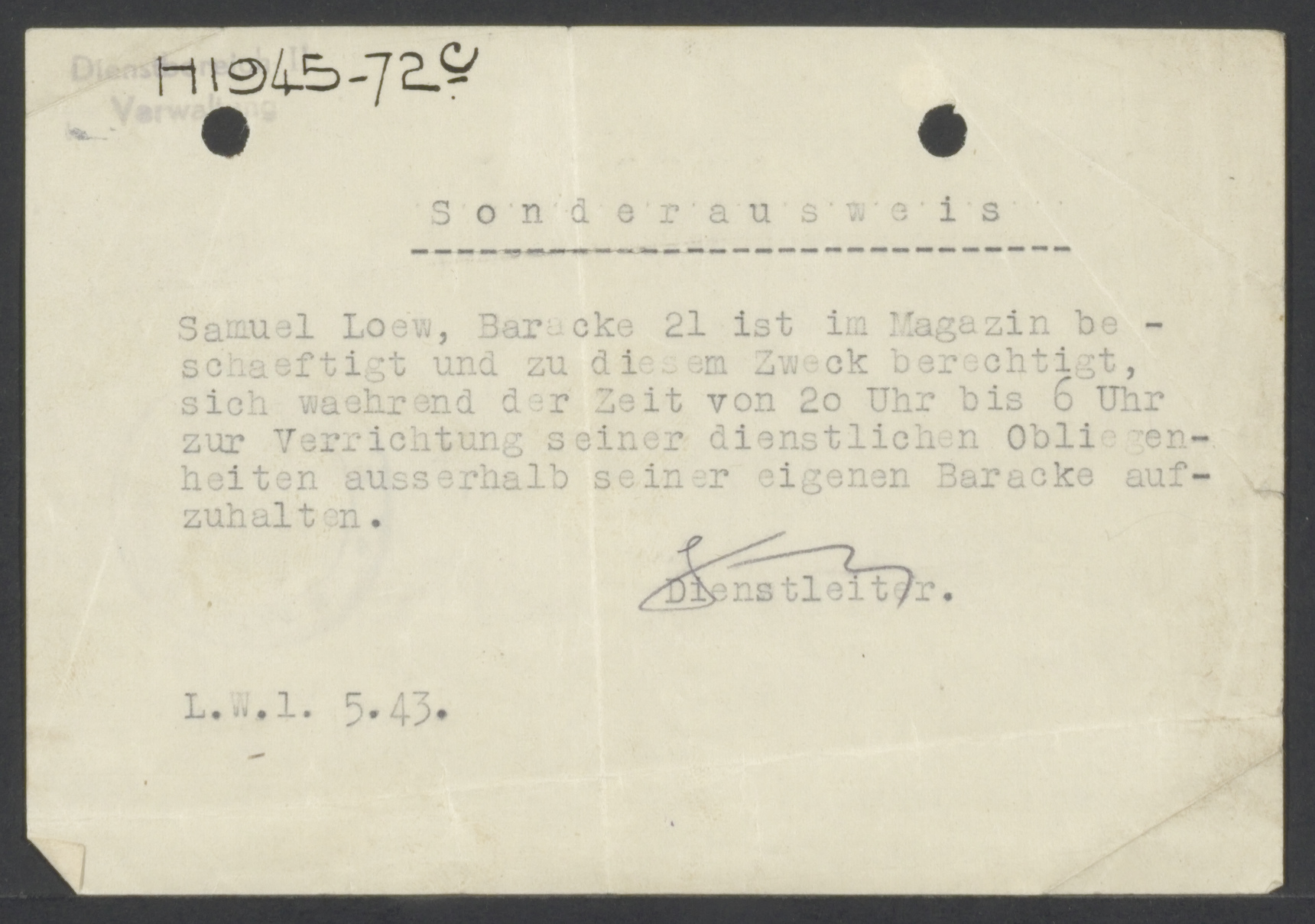 Mededeling door de dienstleider van DB2 Aan: Loew, Samuel Plaats: Westerbork, kamp Datum: 1944-03-14 Betreft het bij een luchtalarm melden op de werkplaats.