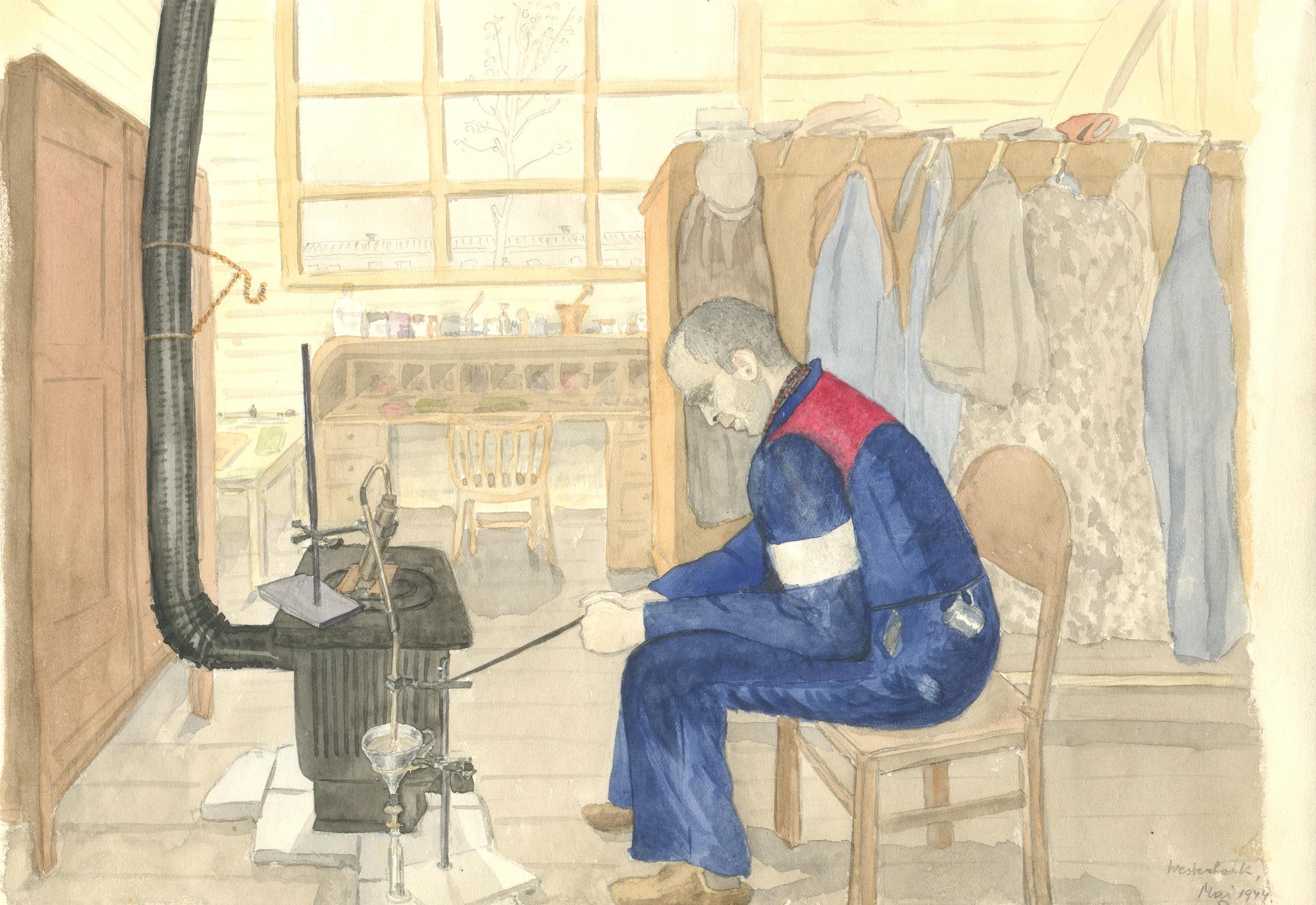Tekening, aquarel van een strafgeval bij een eenvoudig destillatieapparaat getekend door Otto Birman