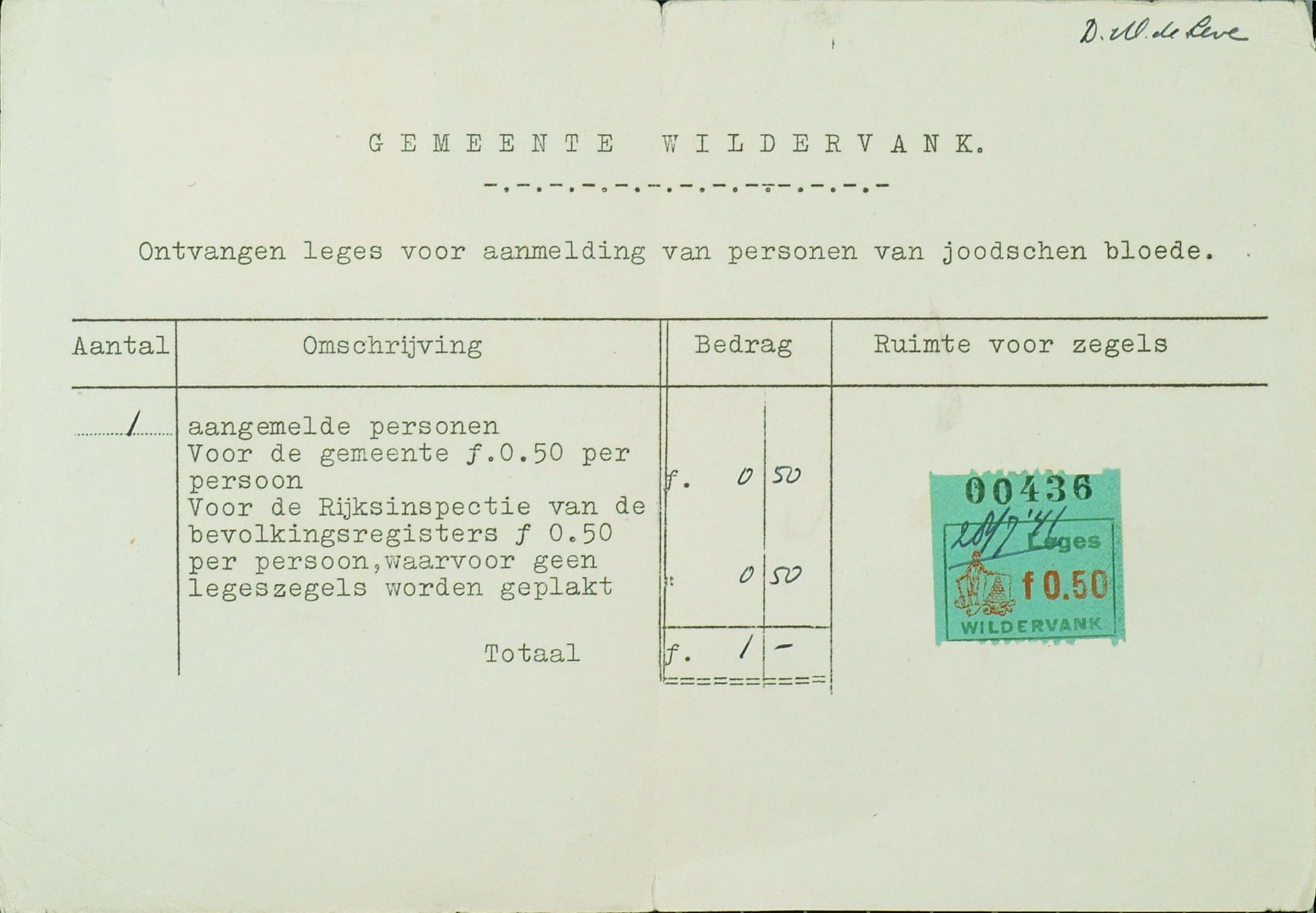 Bewijs van ontvangst van het betalen van leges voor personen van Joodse bloede