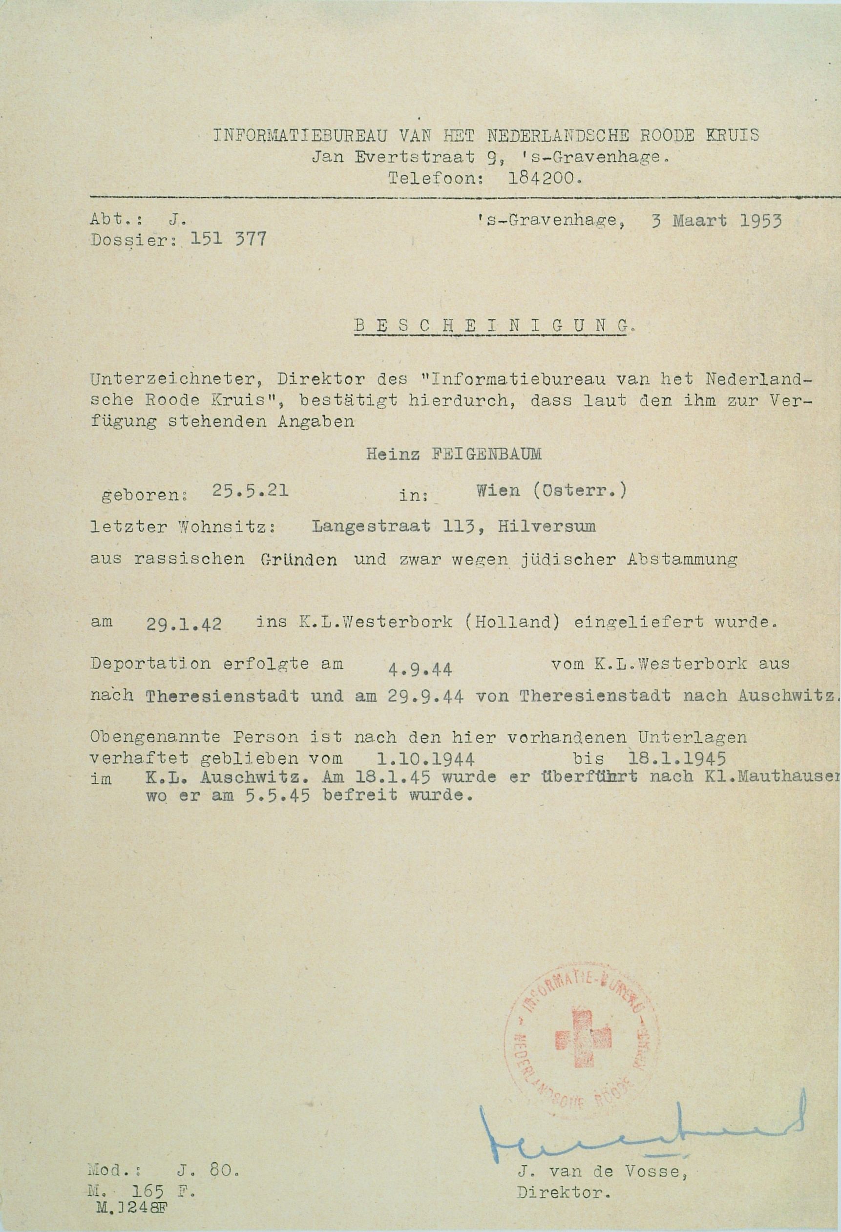 Verklaring van het Rode Kruis over de ouders van Hans Friedheim