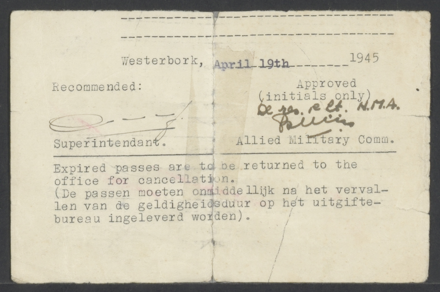 Van: Allied Military Comm. Aan: Querido, Abrham Plaats: Westerbork, kamp Datum: 1945-04-19 Onderwerp: voorlopige pas
