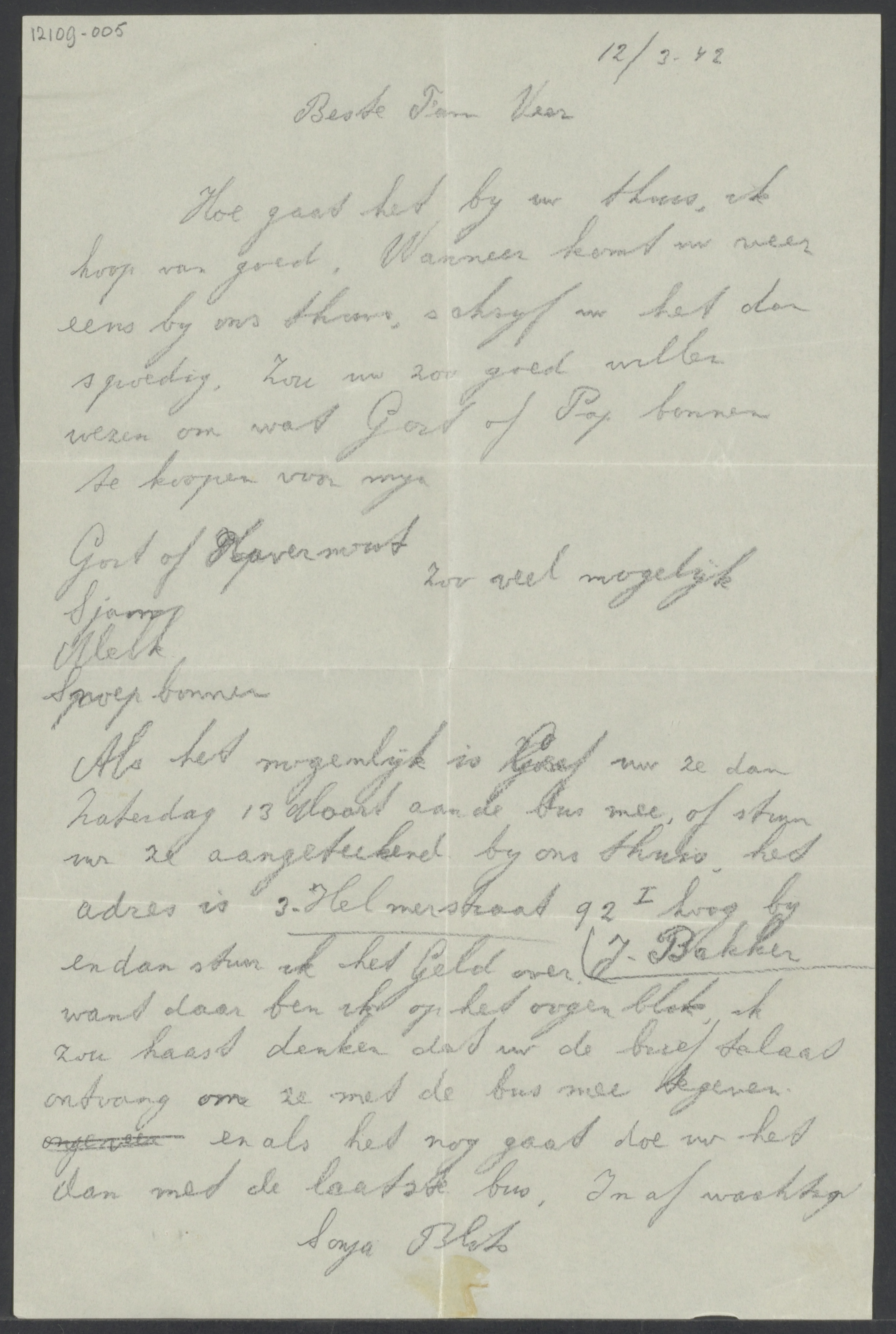 Van: Blits-Lam, Sonja Aan: Veer, familie Plaats: Amsterdam Datum: 1942-03-12 Onderwerp: wanneer de familie langskomt en of ze het een en ander mee willen nemen of anders aangetekend.