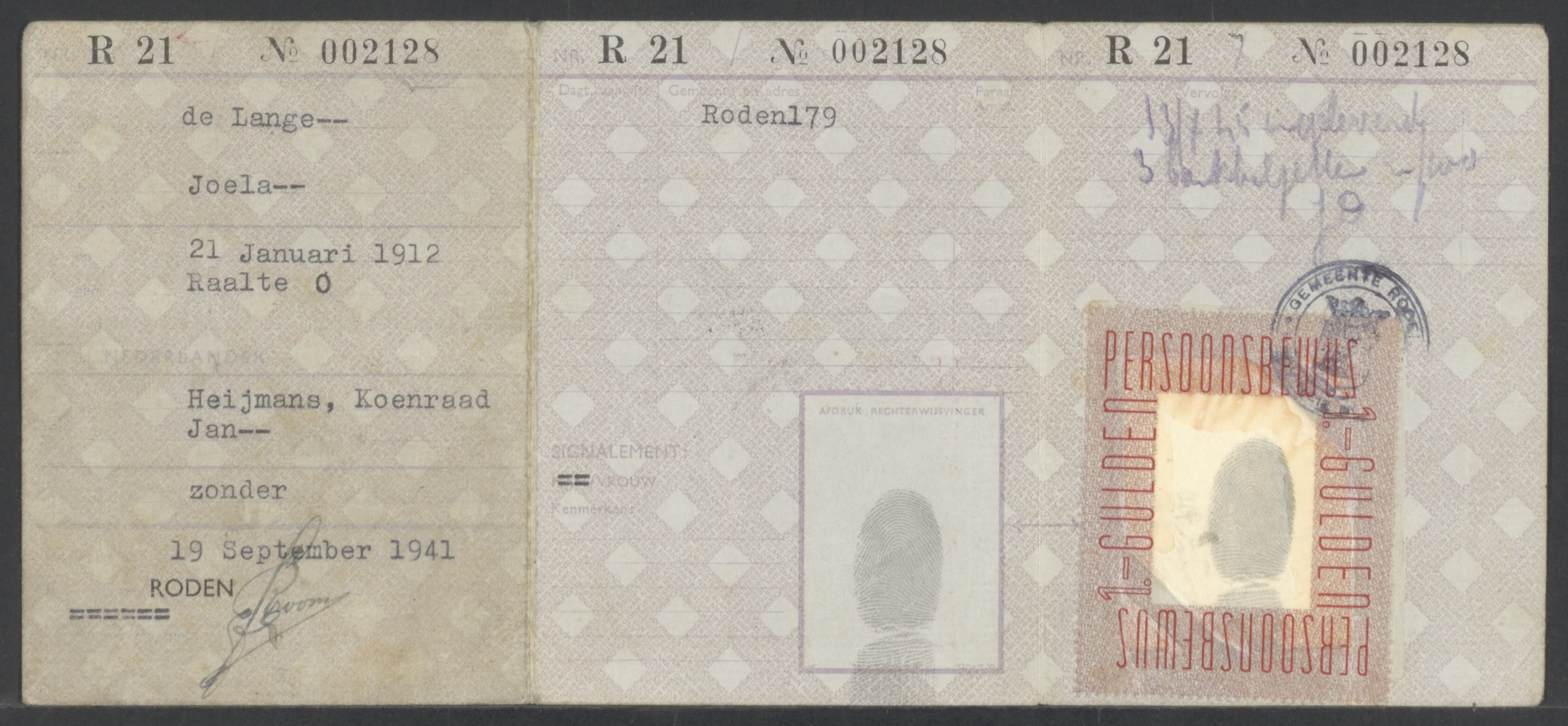 Van: de Gemeente Roden Aan: Heijmans-de Lange, Joela Plaats: Roden Datum: 1941-09-19 Onderwerp: persoonsbewijs met foto.