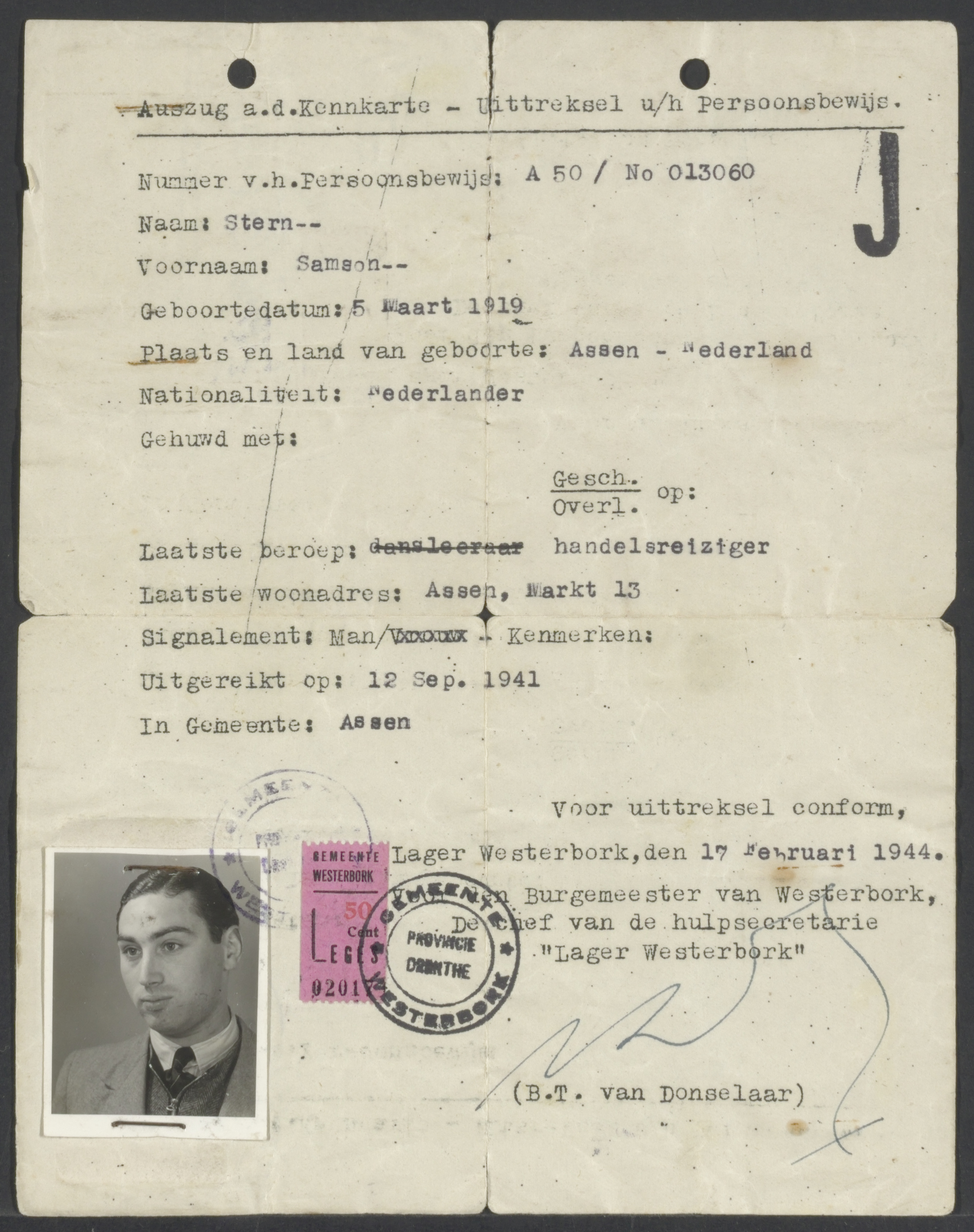 Van: de gemeente Westerbork Aan: Stern, Samson Plaats: Westerbork, kamp Datum: 1944-02-17 Onderwerp: persoonsbewijs (uittreksel) met pasfoto en de letter ‘J’.