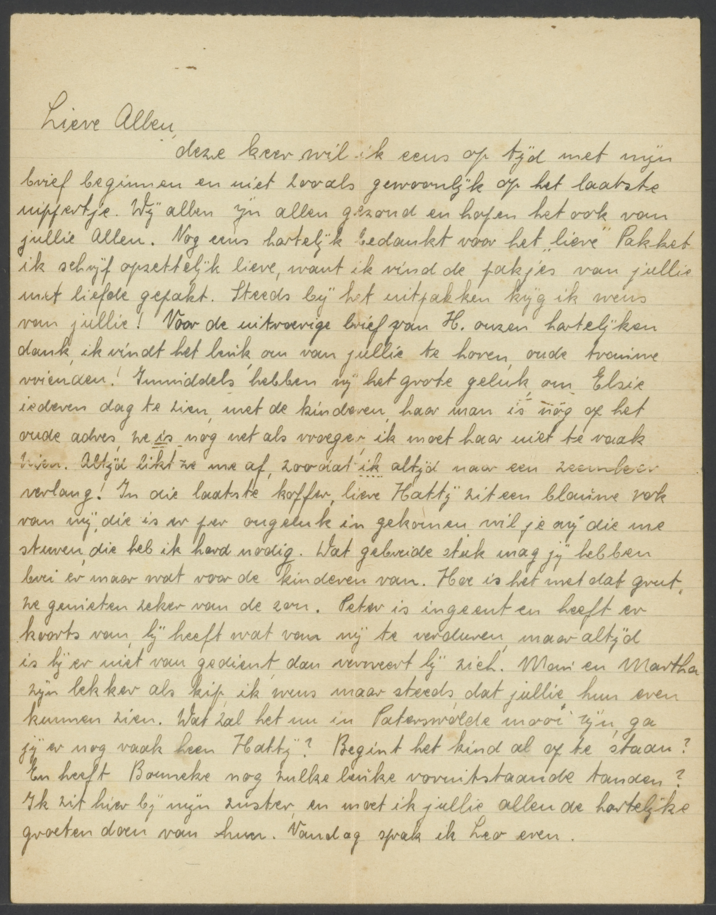 Van: de Groot-Cossen, Hennij en Louis Aan: lieve allen (gezin Samuel de Groot) Plaats: Westerbork, kamp Datum: 1943-06 Onderwerp: dank voor het lieve pakket; hartelijk dank voor de uitvoerige brief van H. (Hendrik, vriend); Peter is ingeënt en heeft er koorts van; met Mau en Martha gaat het goed (lekker als een kip); over Else (vrouw van broer Marcus) en de kinderen (uit Vught gekomen) (Marcus nog op zijn oude adres: Vught), Lois helpt haar met de verhuizing, zij ziet er net als de kinderen (Martin en Erich) verwaarloosd uit; Peter zit te gillen op de stoel en belet mij het schrijven; Of Else en de kinderen kunnen blijven weet Louis nog niet; Hij heeft voor haar een Antrag voor Palestina ingediend (haar broers Joseph en Erich wonen respectievelijk in de buurt van Jerusalem en in Haifa); Louis en zijn gezin hebben en (werk)stempel gekregen en daardoor tijdelijk uitstel van transport…