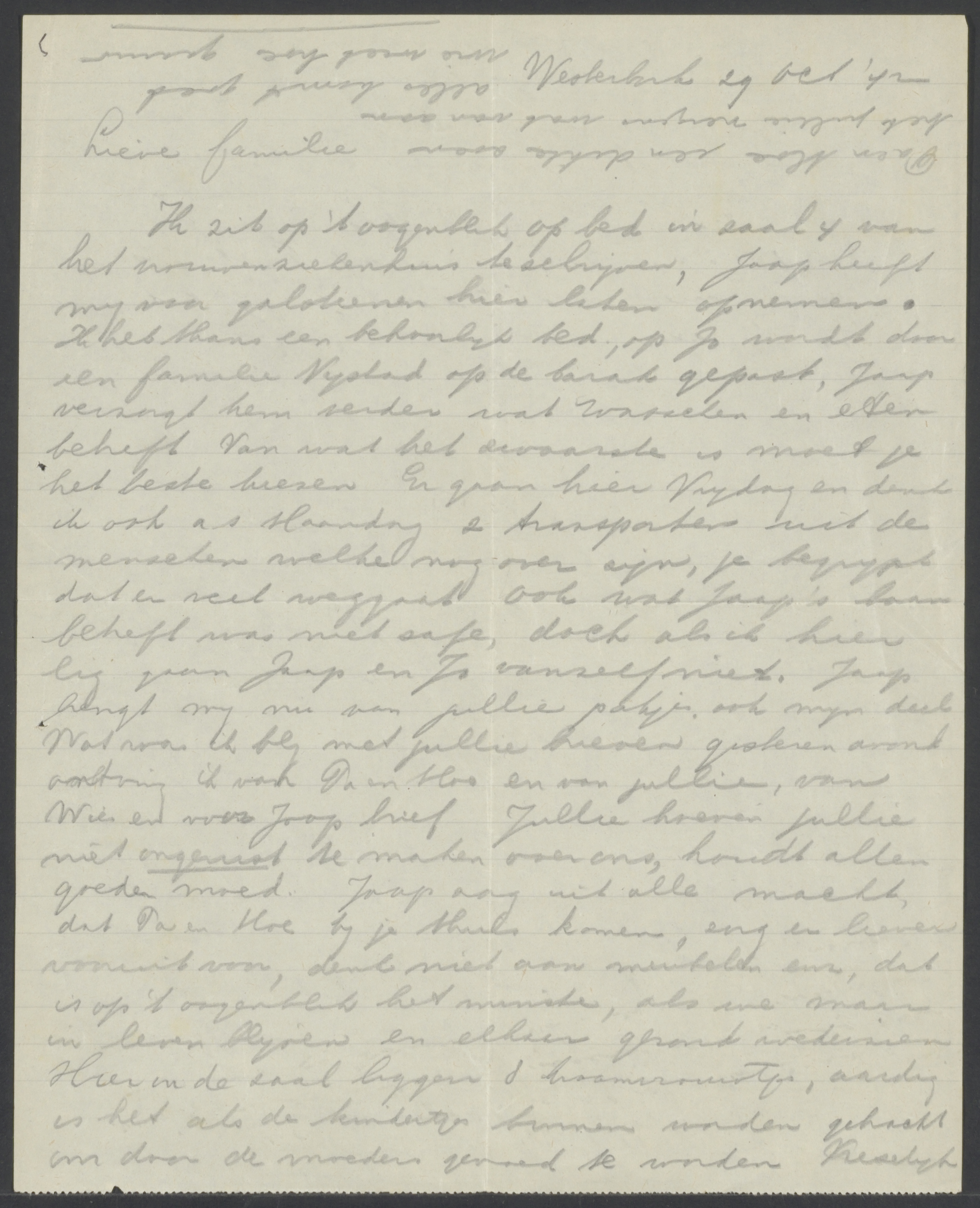 Van: Levie, Dien Aan: haar familie Plaats: Westerbork, kamp Datum: 1942-12-19 Onderwerp: over briefpost, briefkaart om de 14 dagen, 12 regels en dankbriefkaart voor en pakket, 5 woorden; telegram via de JR elke vijf dagen is ook een bewijs dat zij er nog zijn; ze zijn thans in een kleine barak met centrale verwarming, beter dan die grote doorgangsbrakken…; over voedselverstrekking in het kamp, niet kunnen verdragen of niet lekker vinden; het eten is niet voldoende, ze zijn blij met de pakketjes; pakketinhoud; kooktoestel geleend, bruine bonen soep gemaakt; dat mag niet meer, ze is weer overgegaan op een Esbit-apparaat; het is een groot concentratiekamp, zonder slaag; winkels zijn er niet, je loopt buiten alleen tussen barakken; stoelen zijn er niet, alleen banken en krukjes; het eten gebeurd op de ijzeren bedden, op de strozakken; wat ze nodig hebben…; kranten; veel onderduikers komen binnen, zij gaan direct door…; binnenkort zal Jo naar de kampschool gaan, in de barak speelt hij met kinderen van zijn leeftijd, ze vechten ook; op haar huidige locatie eet ze aan tafel en zitten ze op banken, in de barak zijn veel doktersvrouwen; de transporten zijn opgeschort tot na nieuwjaar; ontsteking onder en brug gehad, in het kamp zijn tandartsen, maar alles is primitief; Jo is ordonnans in het ziekenhuis; er wordt gezegd dat er en school komt; veel mensen hebben buikloop, de kampziekte; ze hebben van alles nog, ook zoveel mogelijk Esbit-steentjes; zend geregeld het schone goed terug…; ze missen hun eigen huis, in het kamp is altijd drukte om je heen; hebben jullie brieven ontvangen van een meisje en een familie uit Veendam, zij mochten terug; zou Jaap als ambtenaar niet terug kunnen…?