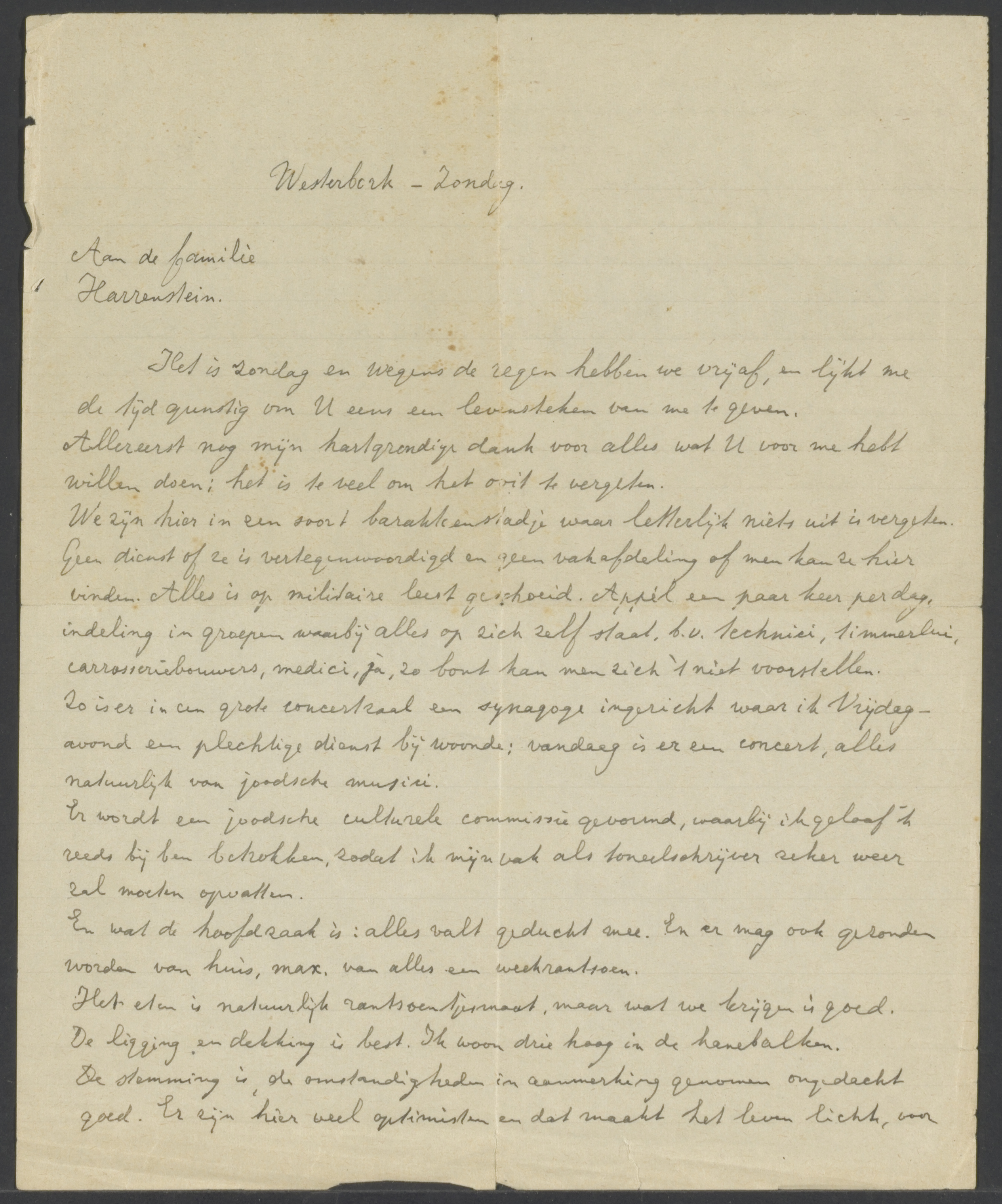 Van: Broekema, Benjamin, Heiman Aan: Harrenstein, familie Plaats: Westerbork, Centraal Vluchtelingenkamp Datum: 1942-07-12 Onderwerp: in een soort barakkenstadje; van alles aanwezig; militaire leest; appel een paar keer per dag; indeling in (werk) groepen; schouwburg als synagoge ingericht; synagogedienst bijgewoond; vandaag een concert met Joodse musici; Joodse culturele commissie gevormd; vak als toneelschrijver weer oppakken; eten is rantsoenformaat, maar goed; slaapt drie hoog, tussen de balken; de stemming is goed; er zijn veel optimisten; alle leeftijden zijn in het kamp aanwezig van jongens van 15 tot mannen van 55; er wordt mondharmonica gespeeld, gekaart, gedamd; hoe een mens onder deze omstandigheden nog zo kan zijn…; SS-leiding; Nederlandse reservekapitein, directe leiding en marechaussee, waaronder plaatsgenoten R. Zuidema en Algra; de sirenes gaan voor het appel…