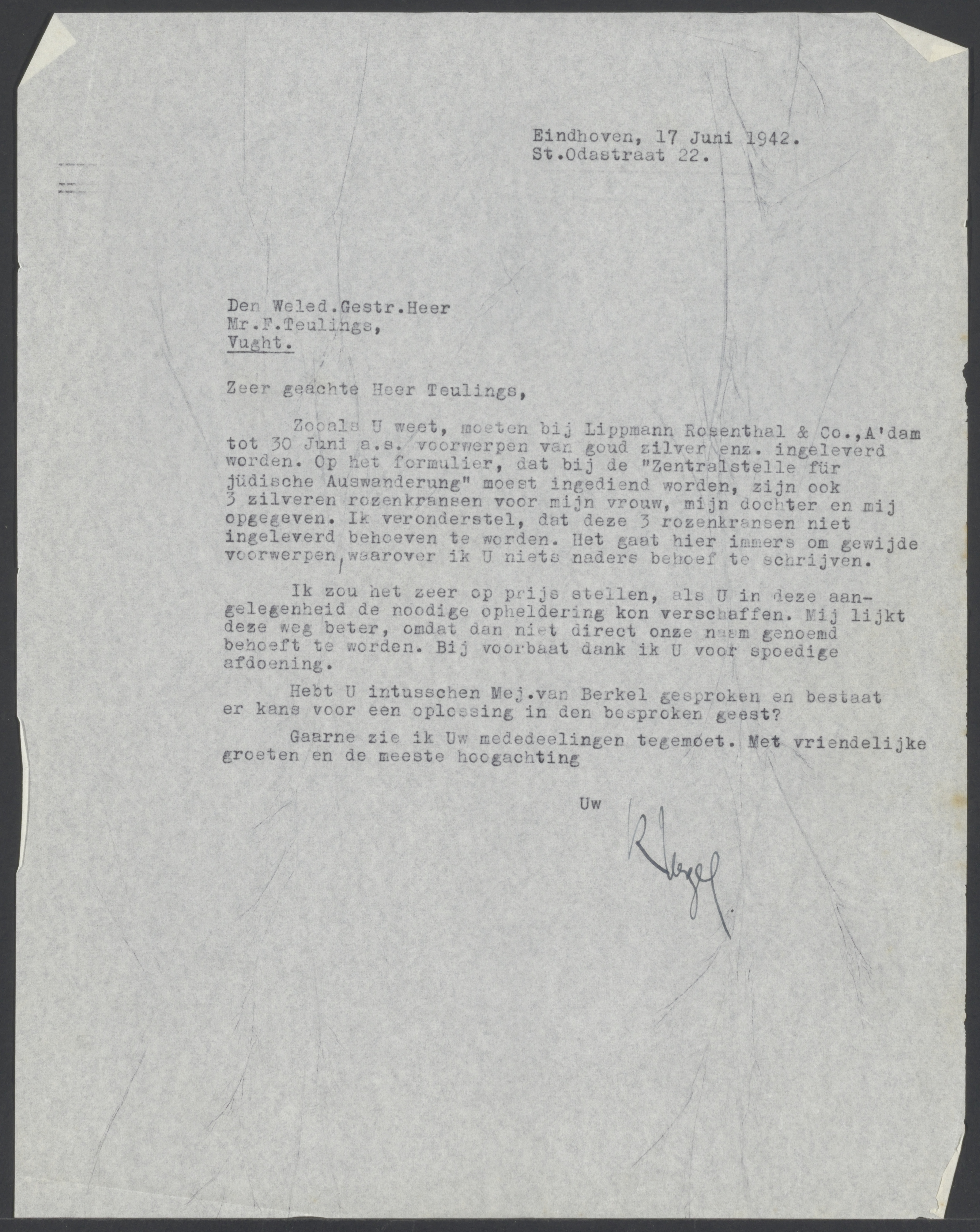 Van: Vogel, Kurt Aan: Mr. Teulings, F. Plaats: Eindhoven Datum: 1942-06-17 Onderwerp: inleveren van waardevolle bezittingen aan Lippmann-Rosenthal; verzoek om te proberen de drie zilveren rozenkransen weer terug te krijgen.