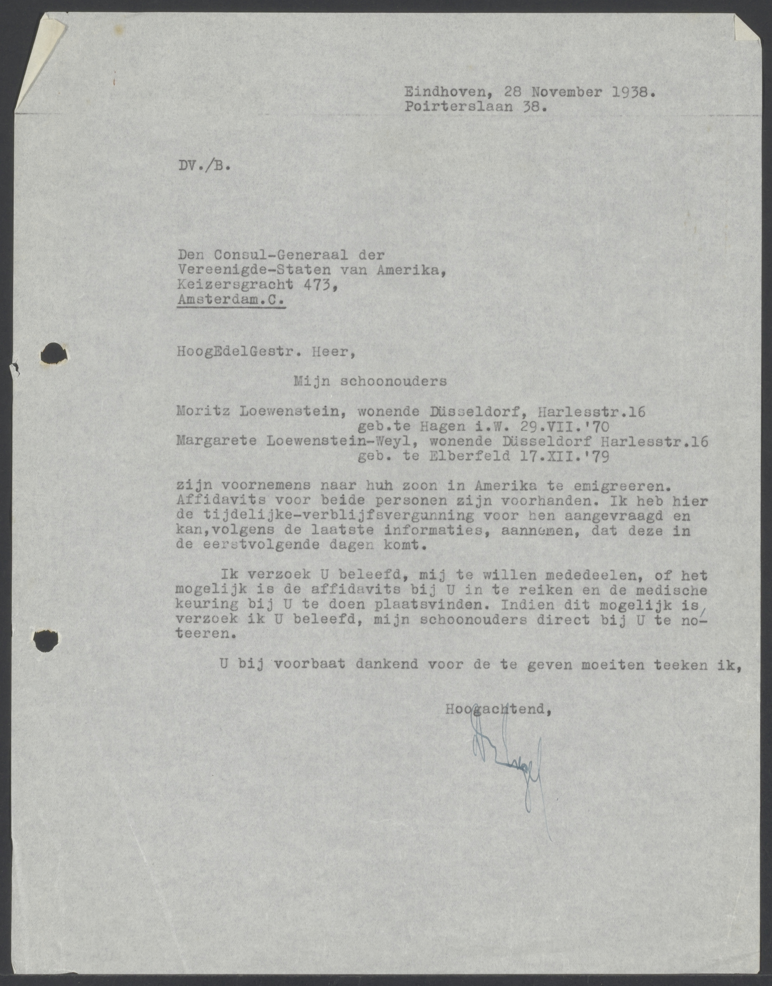 Van: Vogel, Kurt Aan: de minister van Justitie Plaats: Eindhoven Datum: 1938-12-07 Onderwerp: verzoek voor tijdelijk toelaten in Nederland van het echtpaar Dr. Max Weyl-Neufeld en hun enige zoon Werner. Alle drie kunnen verder reizen naar Amerika…