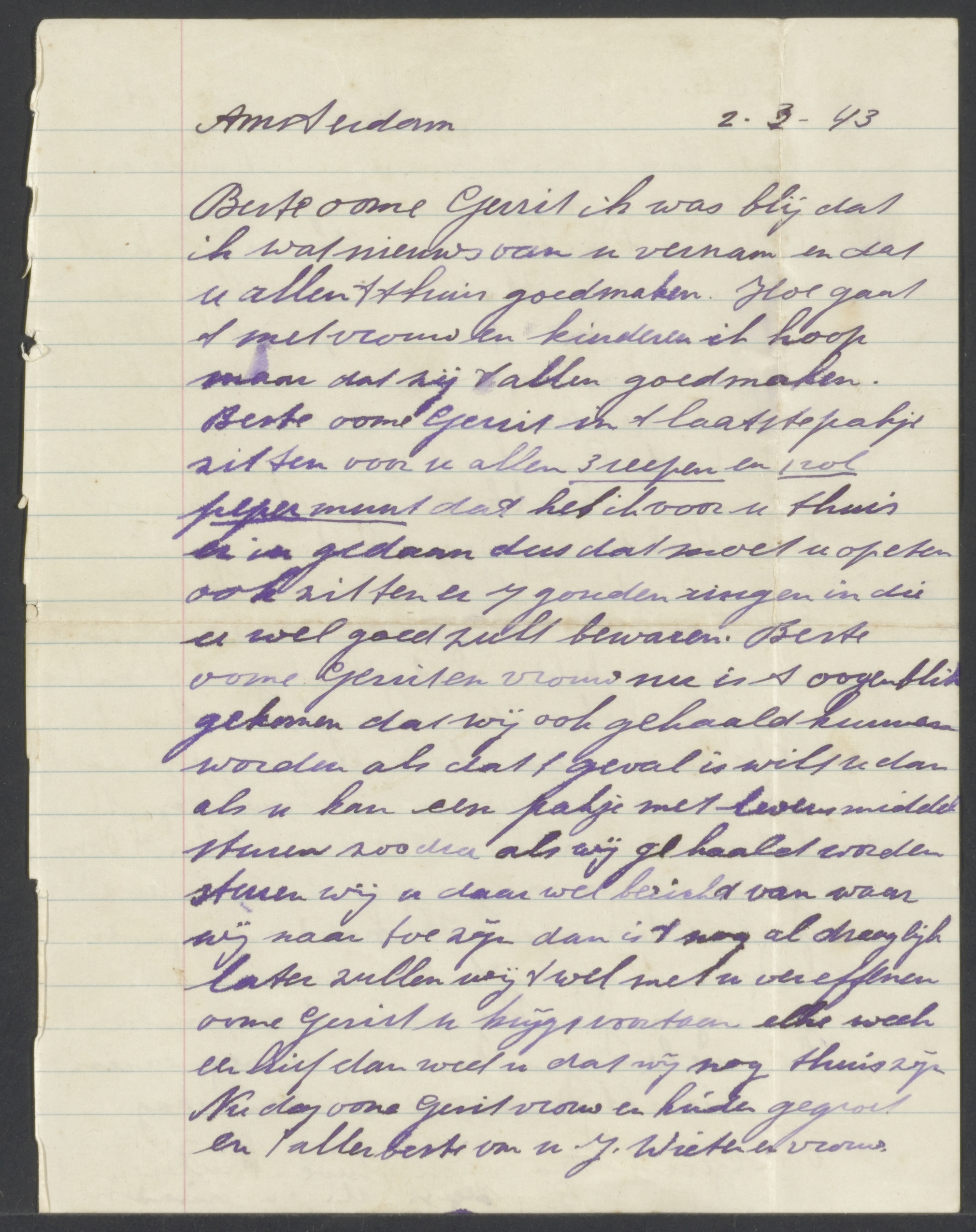 Van: Groenteman, Mozes Aan: oom Gerrit en gezin Plaats: Amsterdam Datum: 1943-03-29 Onderwerp: ze zijn nog thuis en hopen dat de volgende week ook nog te zijn; pakket met kleren naar oom Gerrit gestuurd, mogelijk zitten er nog Jodensterren op, misschien kan hij ze er af halen en deze verbranden; graag in een kast bewaren (valt dan minder op); dat Gerrit het wil bewaren is wel fijn, ze kunnen immers niet alles meenemen; ze worden met de dag zenuwachtiger; ze kunnen niet meer op straat lopen, bang om opgepakt te worden; als ze opgehaald worden zal Mozes het op tijd laten weten; gegevens van Mozes…