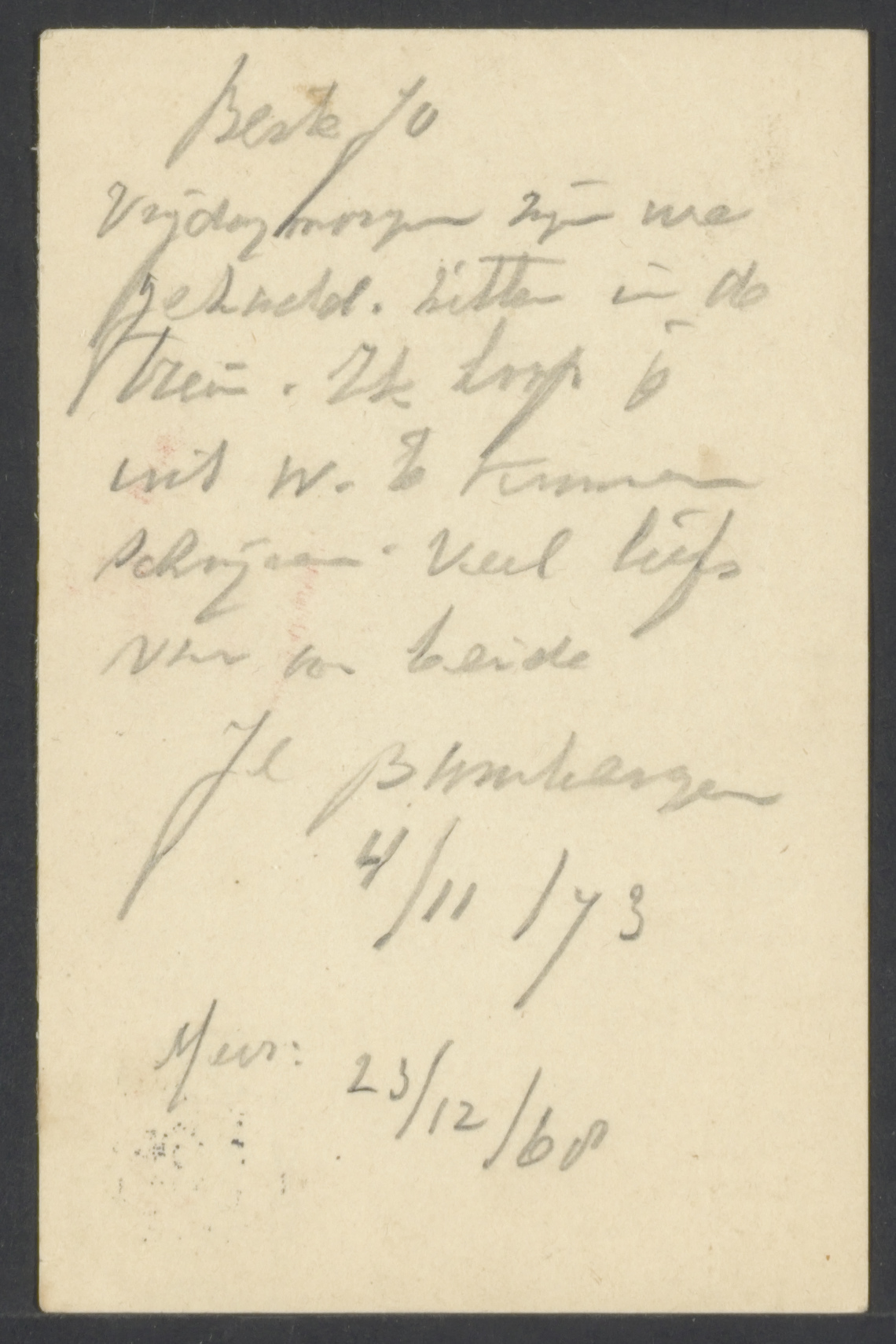 Van: Bamberger Levi en Grietje Aan: Meyer, Jo Plaats: de trein Datum: 1943-06-12 Onderwerp: ze zijn onderweg naar kamp Westerbork en ze hopen vanuit het kamp nog te kunnen schrijven…