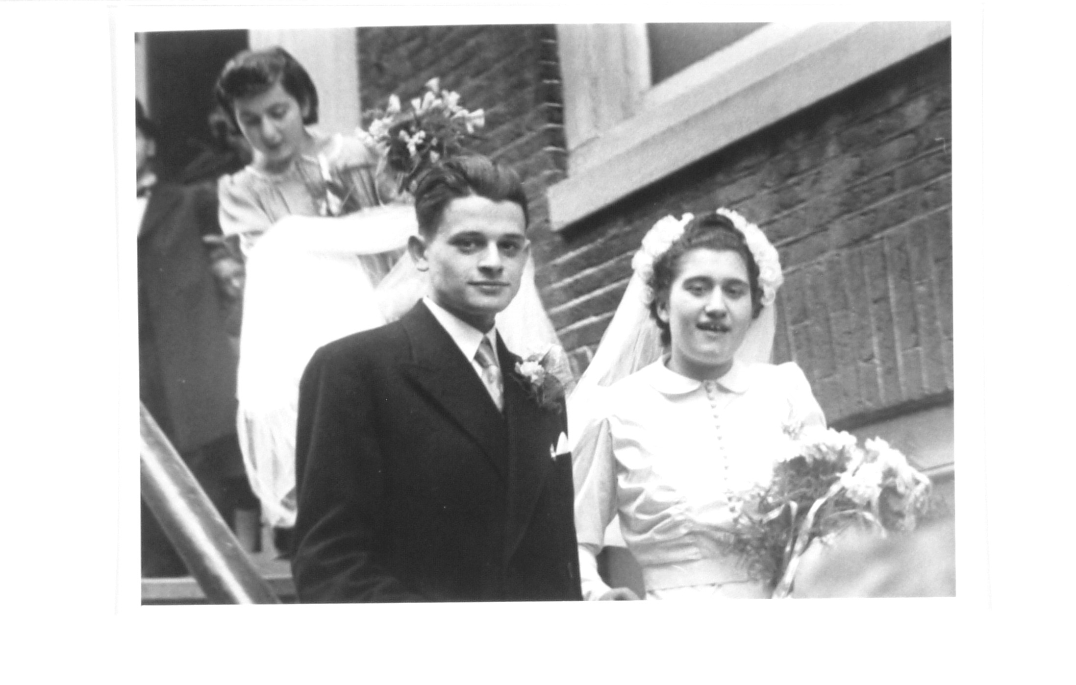 Foto van Jules Schelvis en zijn vrouw rachel bij het verlaten van de synagoge aan de Rapenburgerstaat in Amsterdamam