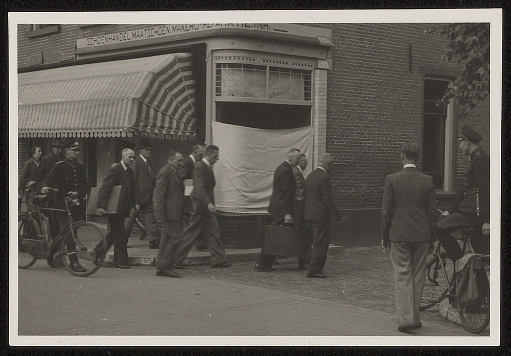 Leden van het distributiecentrum gaan hier vanaf de Nieuwstad richting Zuiderwal. De man rechts naast die met het koffertje is E. Postel sr. (waarnemend hoofd distributiedienst). In de kluis van de Nederlandse Handelsmaatschappij lagen de distributiebonnen enz. van Lochem. Enkele personen haalden die indien nodig op en brachten ze naar het distributiekantoor. Deze handeling werd na de bevrijding nagespeeld.