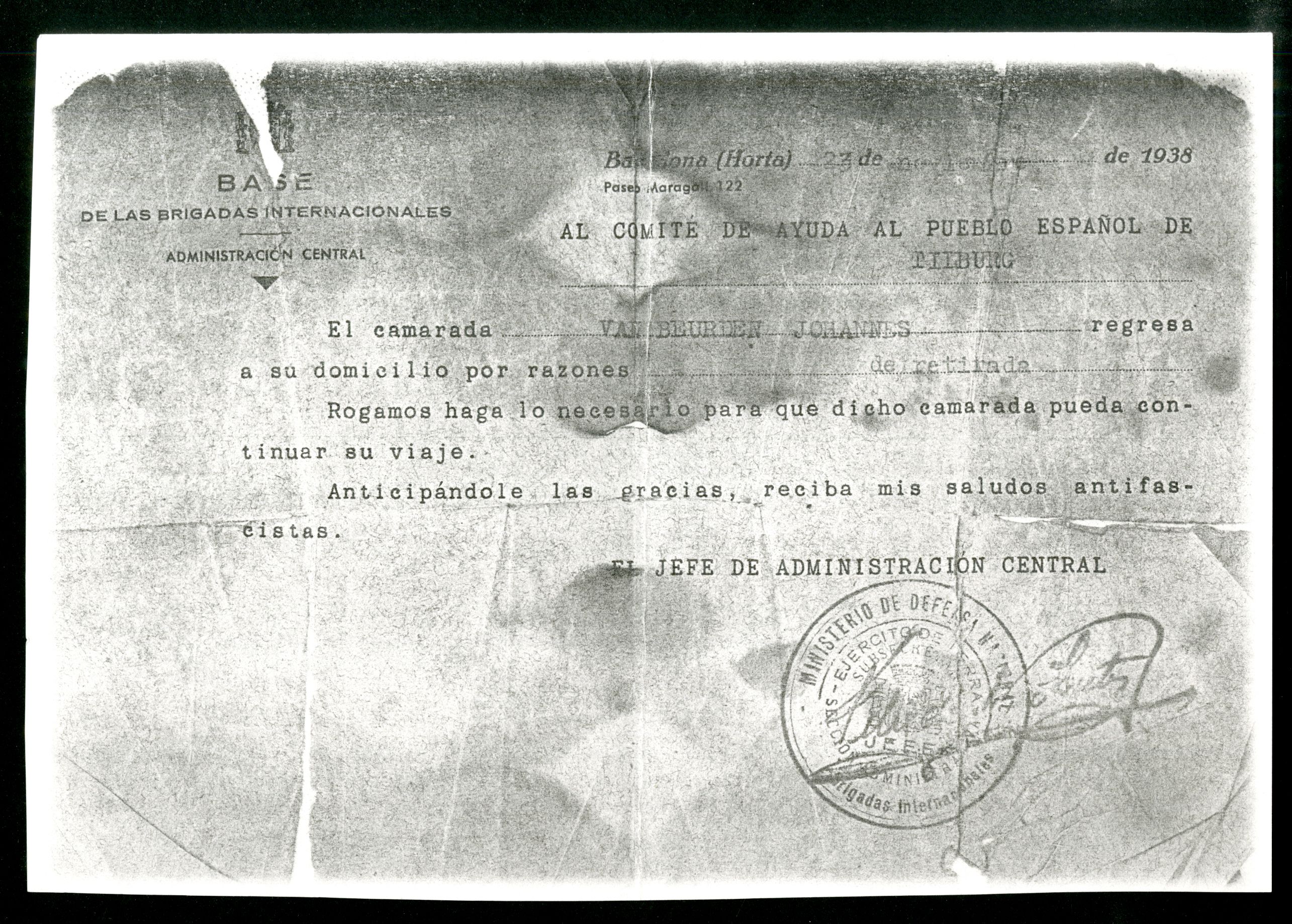 Twee distributie stamkaarten en een 'Vorläufiger Fremdenpass' van Joannes Adrianus van Beurden , een document d.d. 23 november 1938, verstrekt door de centrale administratie van de Internationale Brigades te Barcelona, en drie documenten betreffende een aan oud-strijders toegekende onderscheiding en een receptie op de Spaanse ambassade te Den Haag op 18 november 1996.