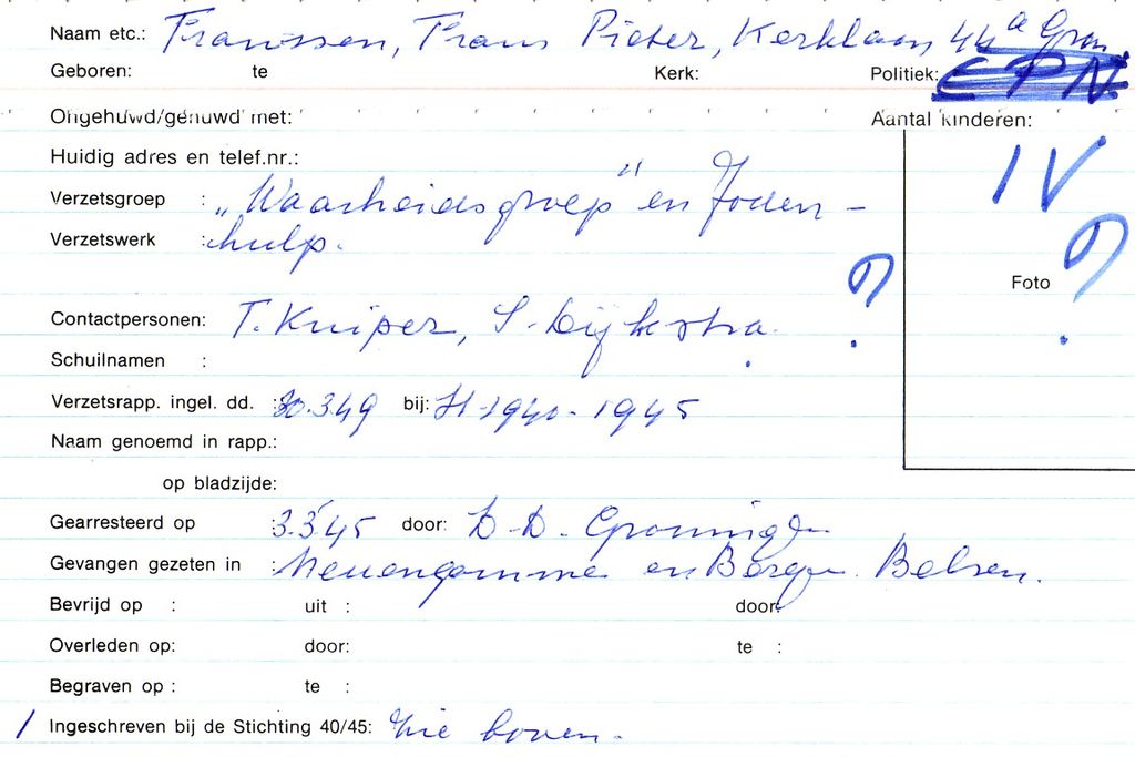 Systeemkaarten met namen van personen uit het verzet: Pieter Raske