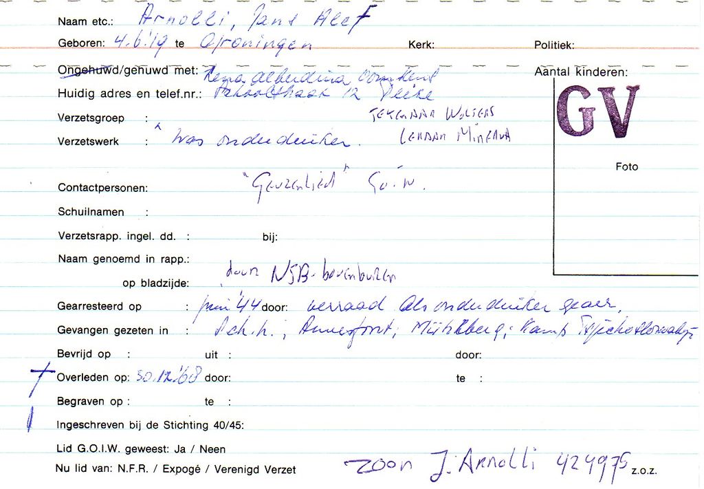 Systeemkaarten met namen van personen uit het verzet: Jans Alef Arnolli