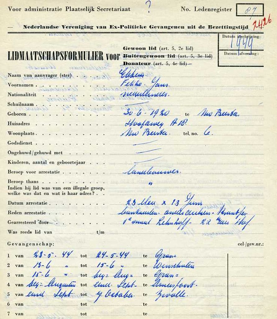 Was onderduiker, zie ds Zuiderduyn. 'Geuzenlied GOIW' [Zie de rapportenmap van de GOIW, 2220 - 680. Betrokkene was een der ondertekenaars van een verzoek aan de GOIW om het Geuzenlied te herdrukken, 1945-06=13] In juni 1944 als onderduiker gearresteerd door verraad van bovenburen die NSB-aanhangers waren. Gevangen gezeten in achtereenvolgens het Scholtenshuis, Amersfoort, Mühlberg en een kamp in Tsjechoslowakije