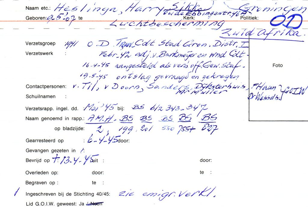 In 1940 begonnen met Vrij Nederland. Later Trouw rayon NO-Groningen. In '44 op verzoek van Piet Dijkema bij de KP gekomen. Meegedaan aan de overval in Slochteren die vier van de acht KP-ers het leven kostte [Betrokkene komt misschien voor als Harry in het rapport Geesje Bleeker]