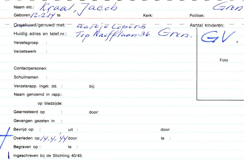[Geen verzetsactiviteiten vermeld op de kaart maar betrokkene heeft toch postuum het verzetsherdenkingskruis gekregen. Ook enigszins raadselachtig is het huwelijk met Aaltje Lopers die ook op de kaart van Kornelis Kraal als echtgenote wordt genoemd]