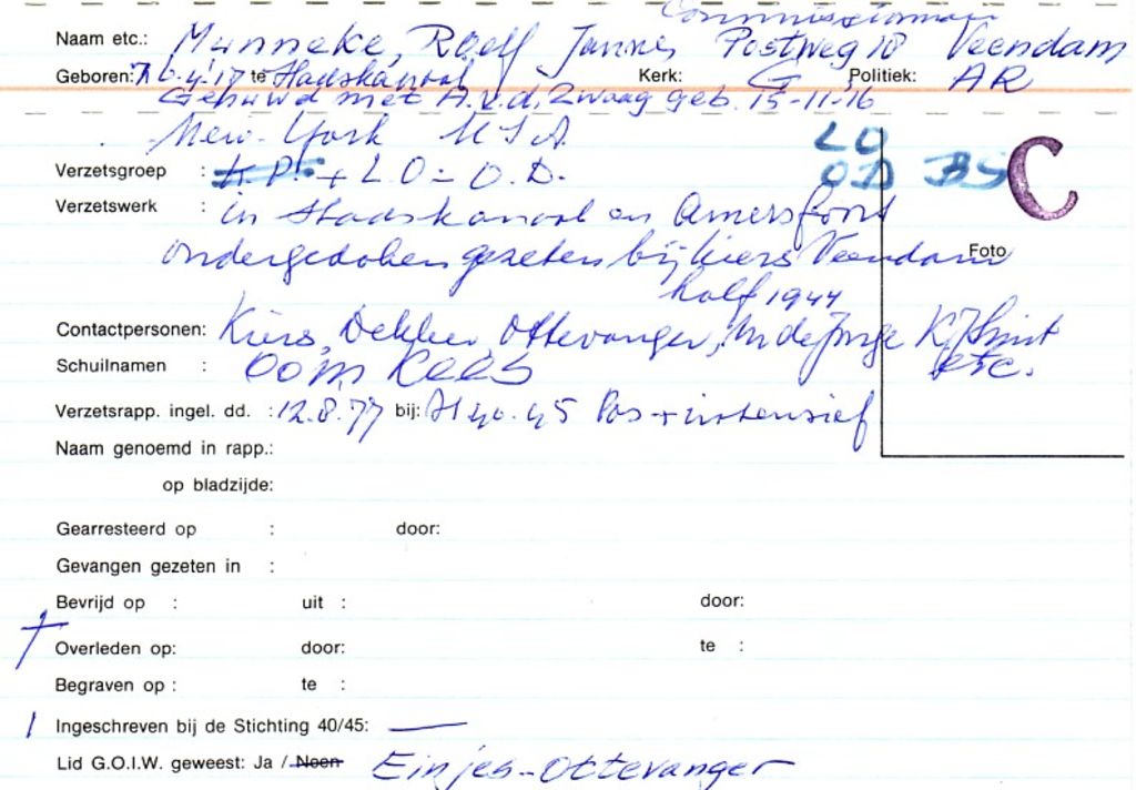 Systeemkaarten met namen van personen uit het verzet: Roelf Jannes Munneke
