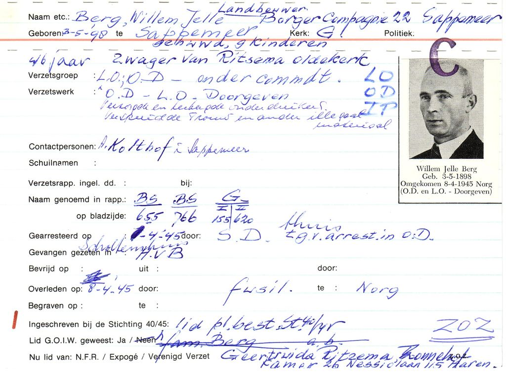 Systeemkaarten met namen van personen uit het verzet: Willem Jelle Berg