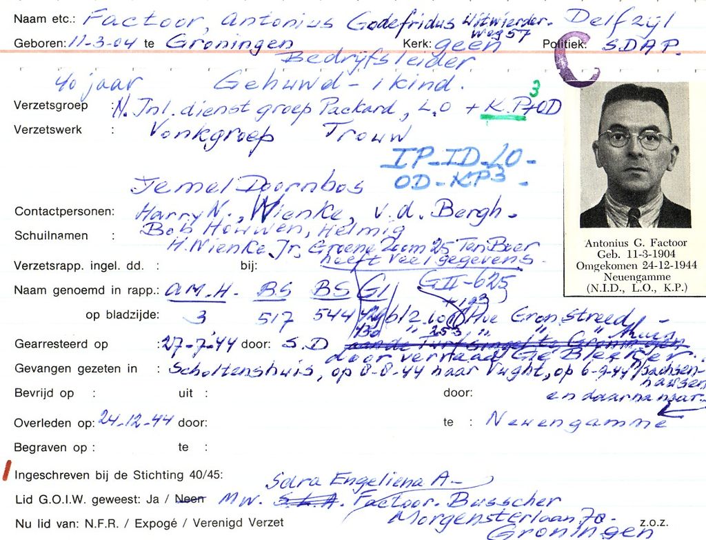 Door de SD in zijn eigen zaak gearresteerd, vermoedelijk na peiling, 09-11-1944. Was ook in het bezit van 20 bonkaarten. Gevangen gezeten in het Scholtenshuis Onderduikers ondergebracht, onder andere bij Karssies. Groep Packard, zender Beatrix in zijn zaak in de Gelkingestraat gehad