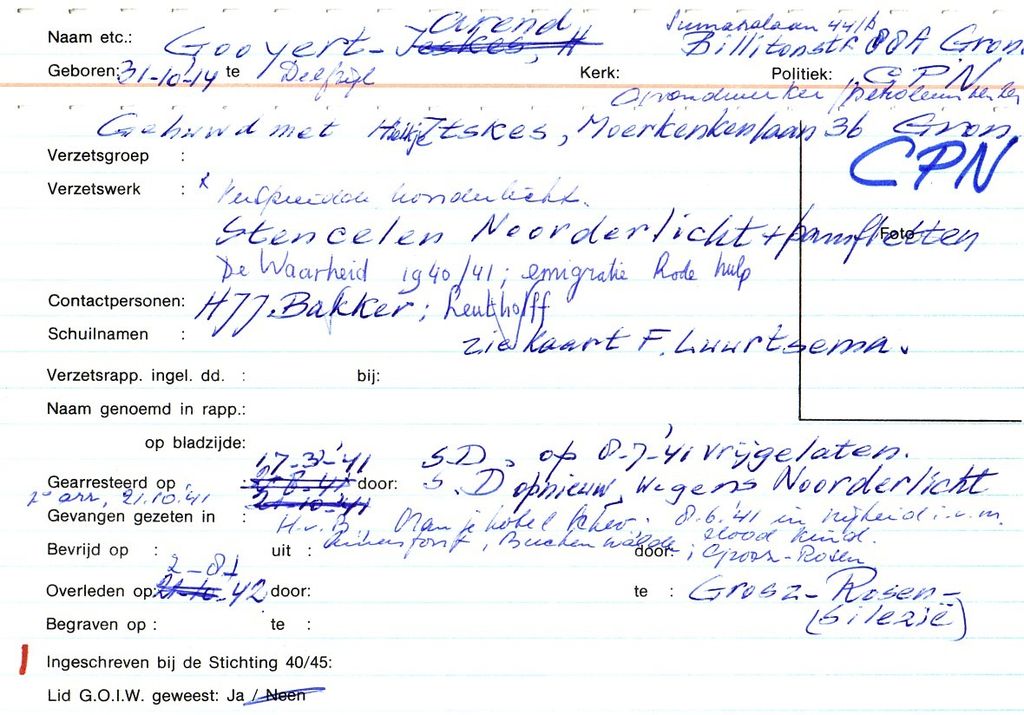 Systeemkaarten met namen van personen uit het verzet: Arend Oldenbeuving