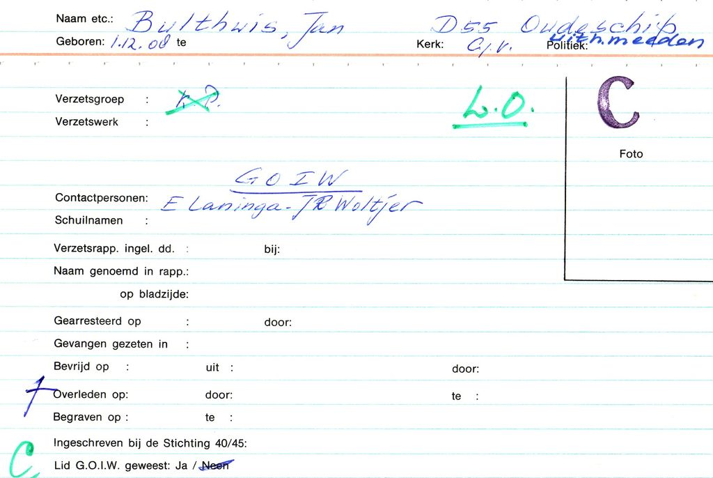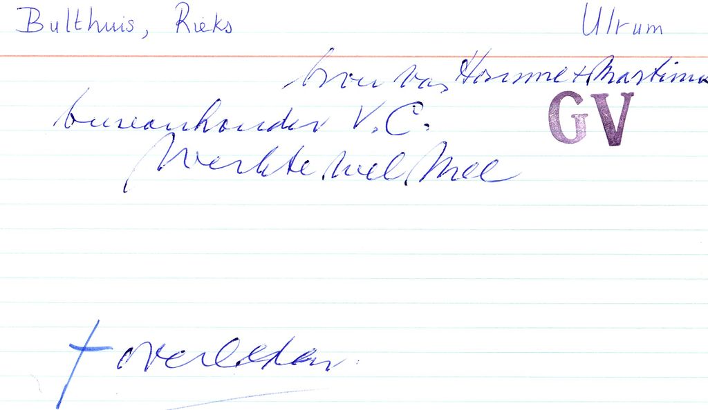 Systeemkaarten met namen van personen uit het verzet: Martinus Henderikus Bulthuis