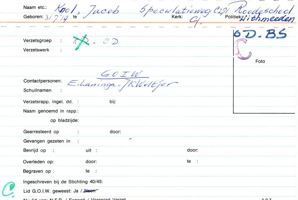 Systeemkaarten met namen van personen uit het verzet: Jacob de Vries