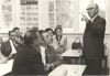 Oud-leerlingen hebben weer even plaatsgenomen in de schoolbankjes en volgen een les. In achterste bankje rechts zit Jan Heering, schuin voor hem zit Gré Mantel. In voorste bankje zitten J. Krijger en zijn echtgenote mevrouw Kuijer (?). In achterste bankje links zitten Gré Visser en Gert Wonder, voor hen zitten de dames, v.l.n.r.: Tiny Kofman, Aagje de Vries en Trijntje Hokkeling. In voorste bankje zitten Jb. Sanstra (l.) en Willy de Hart.