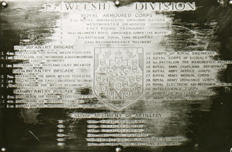 Het nieuw opgerichte en onthulde herdenkingsmonument voor de 53rd Welsh Division, onthuld 25 oktober 1952. De stad werd door de 53rd Welsh Division bevrijd, van welke divisie ook de meeste gesneuvelden afkomstig zijn.