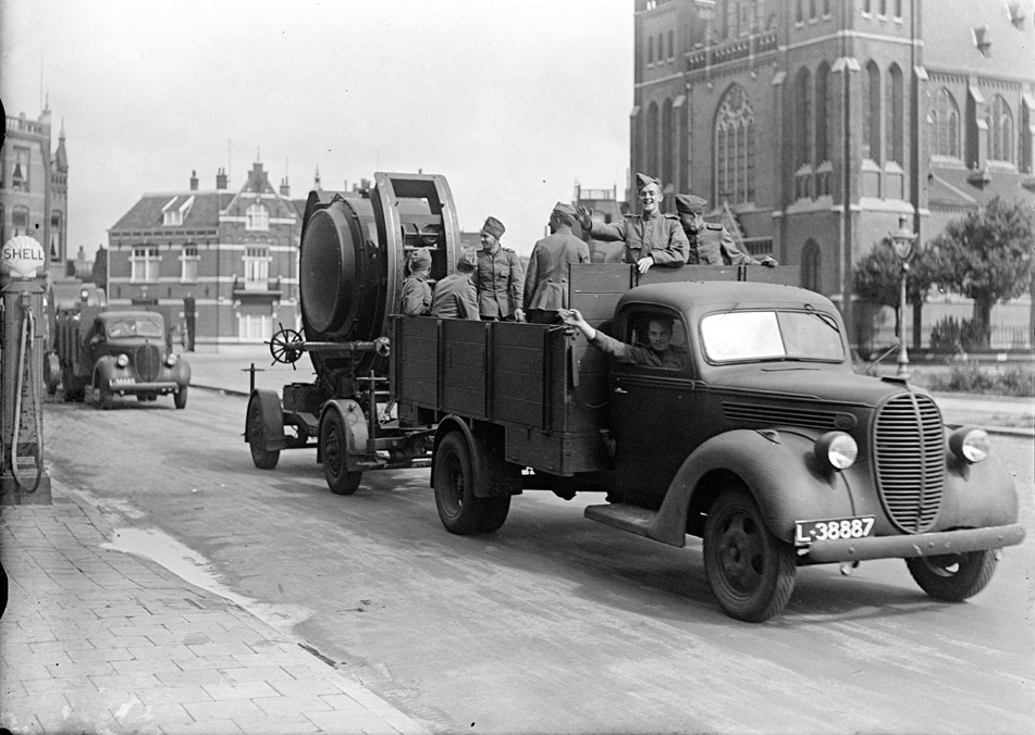 De oostzijde van het Emmaplein met links gedeelte van de Sint Leonarduskerk. In het midden de in 1944 verwoeste meisjes-school en rechts de eveneens verwoeste Grobbendonckstraat. Rechts onder een schuilkelder van de Luchtbeschermingsdienst (panoramanegatief). De foto is hoogst waarschijnlijk genomen vanuit het kantoor van fotopersbureau het Zuiden, dat er recht tegenover zat.