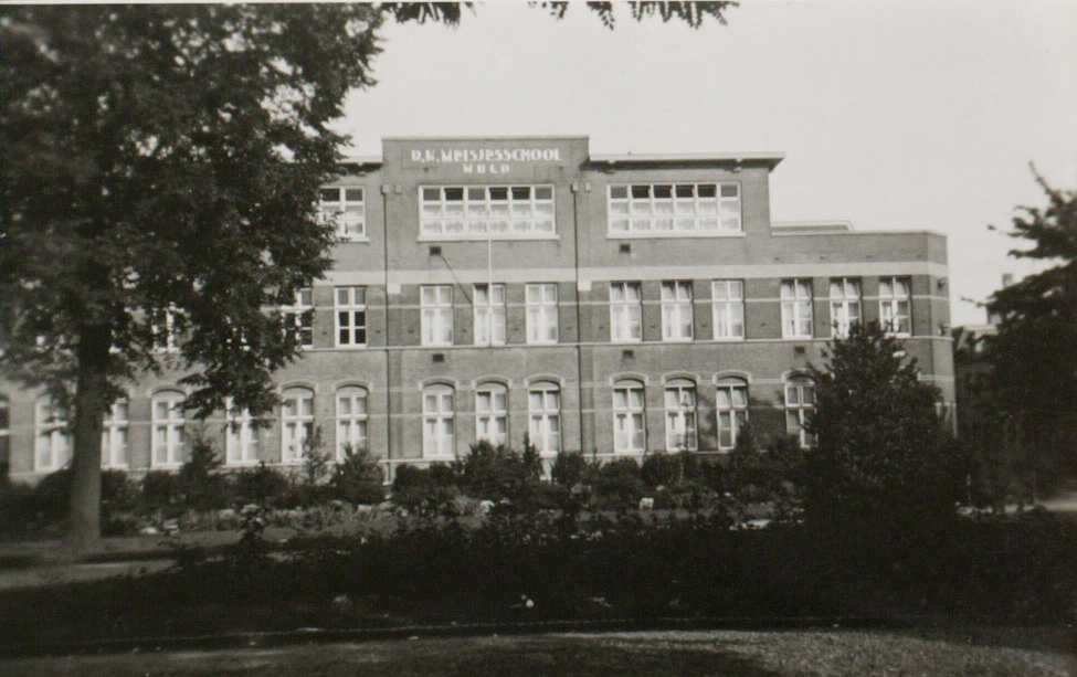 Voorgevel van de R.K. meisjesschool MULO van de zusters JMJ met plantsoenaanleg op het plein voor de school.