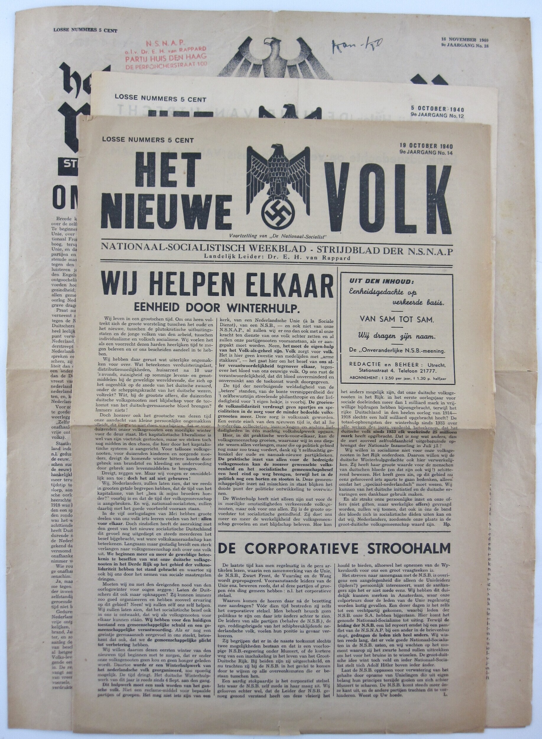Drie exemplaren van "Het Nieuwe Volk", Nationaal-Socialistisch weekblad van de N.S.N.A.P. Het betreft jaargang 9, van 5 en 19 oktober 1940 en 16 november 1940. Het exemplaar van november heeft een ander papierformaat en heeft een rood stempel van het Partijhuis Den Haag.