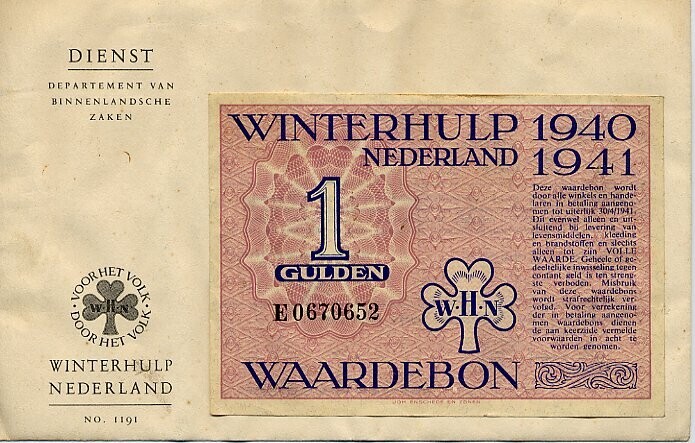 Een enveloppe met opgeplakte waardebon van de "Winterhulp Nederland 1940-1941" voor een bedrag van 1 gulden en geldig tot 30 april 1941. Deze waardebon kon alleen tot het volledige bedrag worden besteed bij winkels en alleen voor levensmiddelen, kleding en brandstoffen. Linksboven op de enveloppe: "Dienst. Departement van Binnenlandsche Zaken" en linksonder het logo van de Winterhulp Nederland.