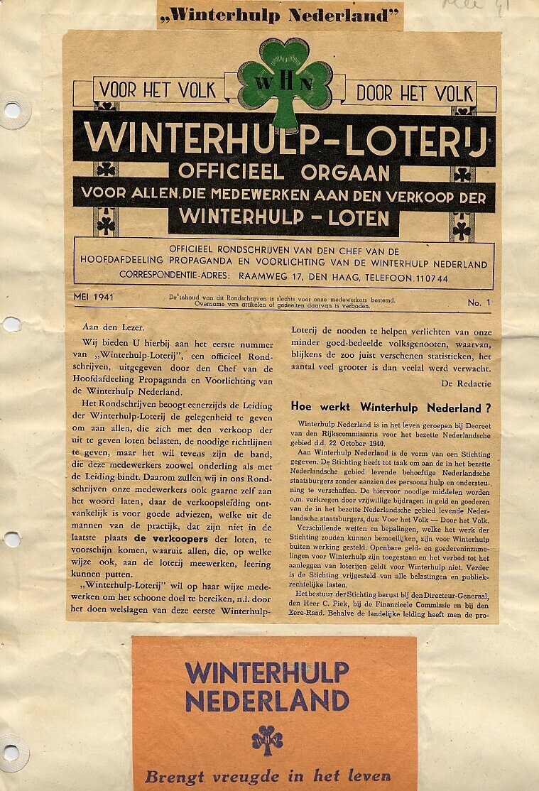Een krantenknipsel gedateerd: mei 1941 no. 1, over de Winterhulp loterij voor degenen die meewerken aan de verkoop van loten. Bijgevoegd een groen klavertje met het logo van de Winterhulp en een oranje strooibiljet met de ''Winterhulp Nederland. Brengt vreugde in het leven Uwer landgenooten!'.